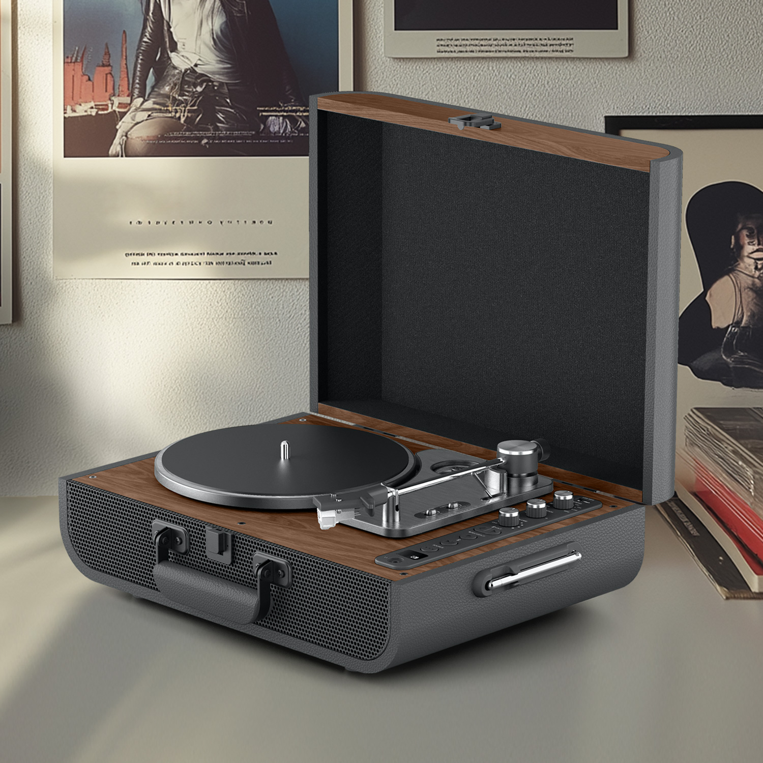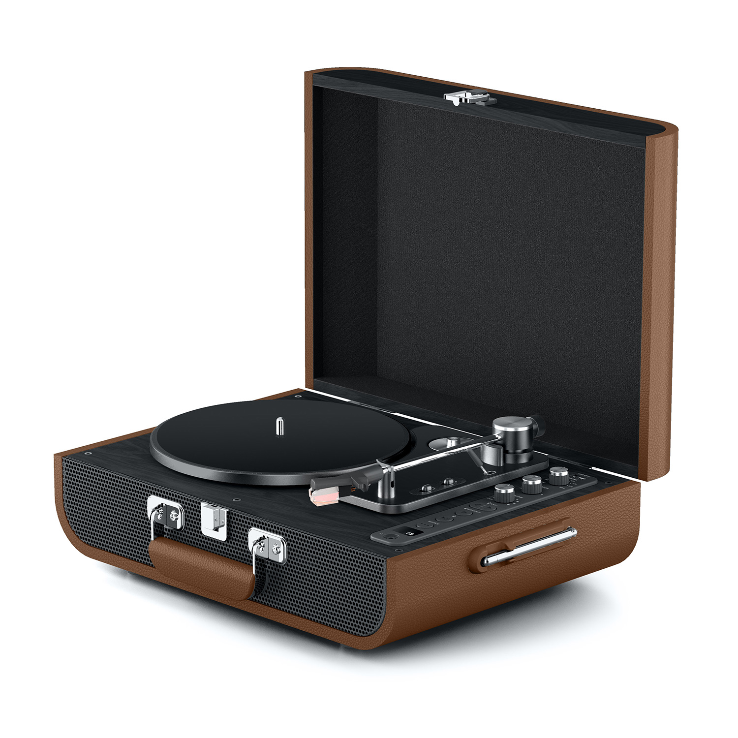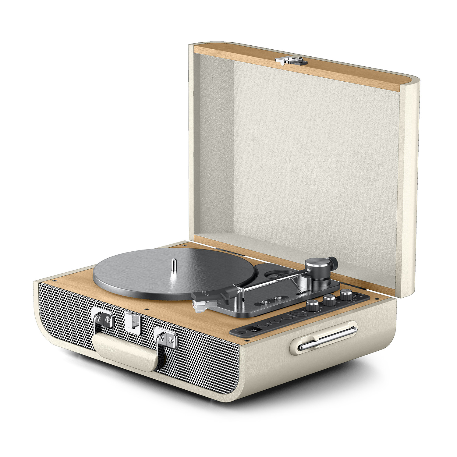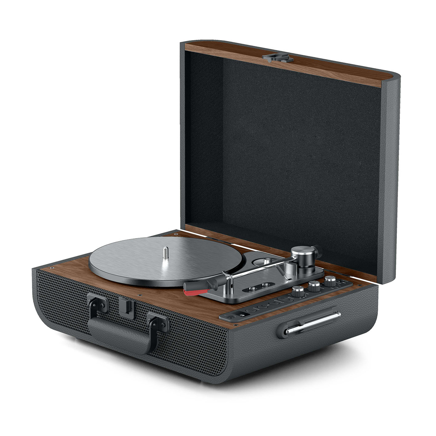 FM analogue tuner, 3 speed turntable, wireless connection in & out