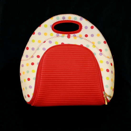 The picture displays an adorable semi-circle lunch bag. The lunch bag is made of polyester and NBR for robust construction. With an eye-catching style and vibrant colors, this lunch bag makes a chic item for girls to carry their lunch.