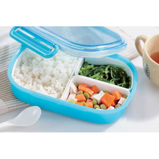 Featured is a lunch box with a rounded rectangular shape. It features three detachable compartments for organized storage of various types of food. The transparent lid seals the box tightly to prevent leakage.