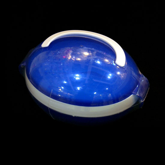 This lunch box comes in an oval shape in a blue and white. Two sides are crafted with a clip for secure closure and the top with a handle for convenient carrying. Made of high-quality plastic, the lovely lunch box bestows robust construction and exceptional durability.