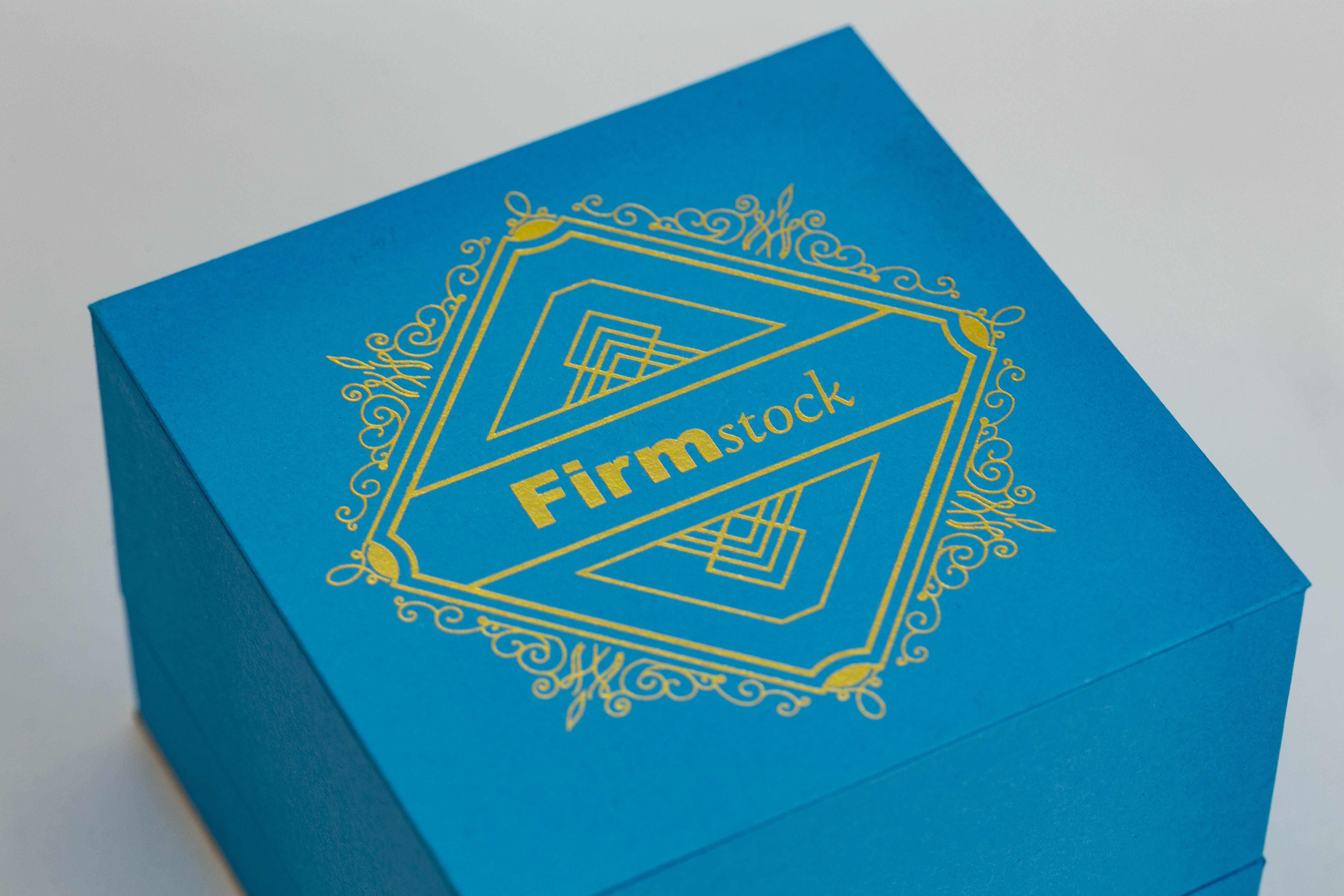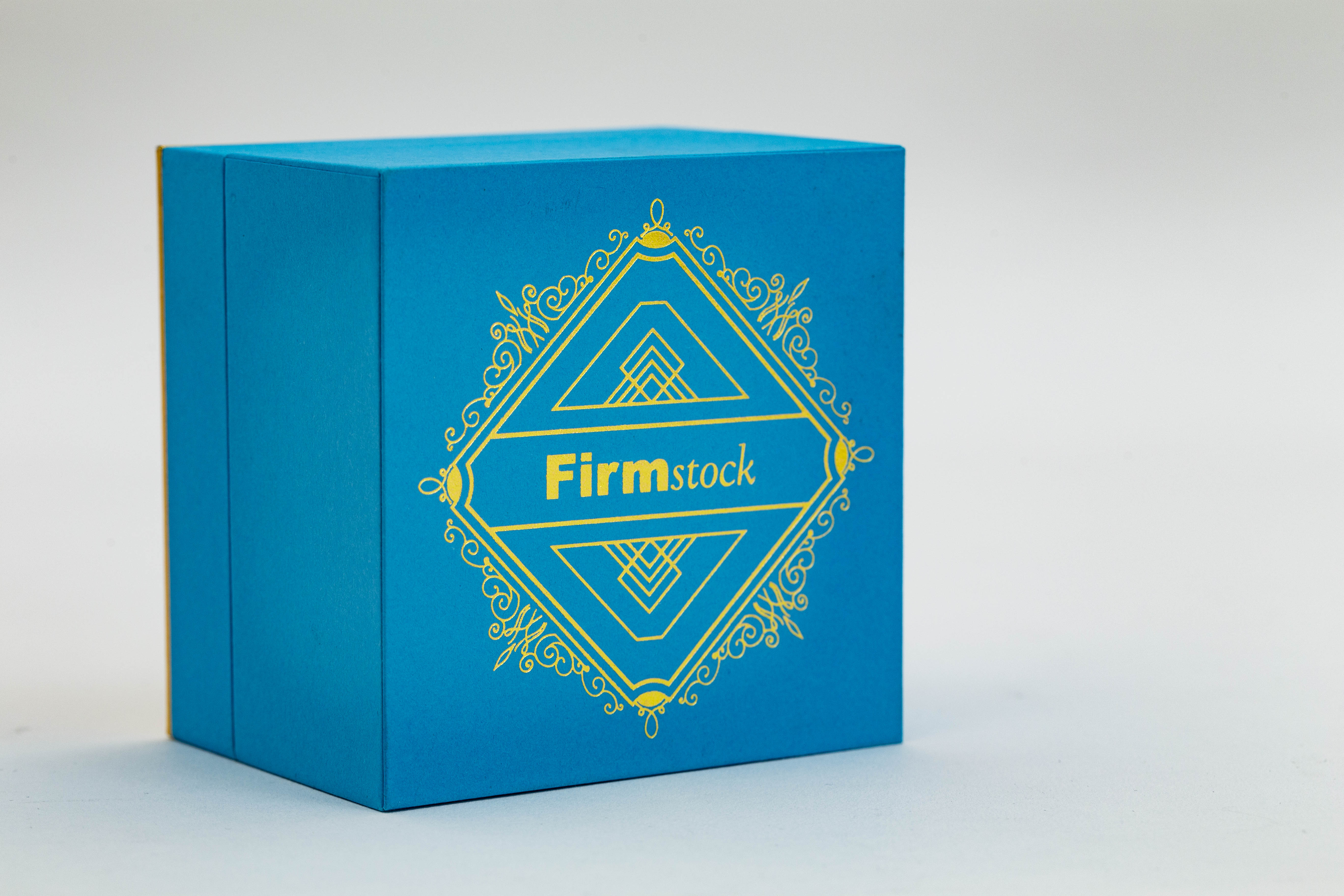 Outside : cardboard wrapped by blue paper , with pattern/ logo on the box top