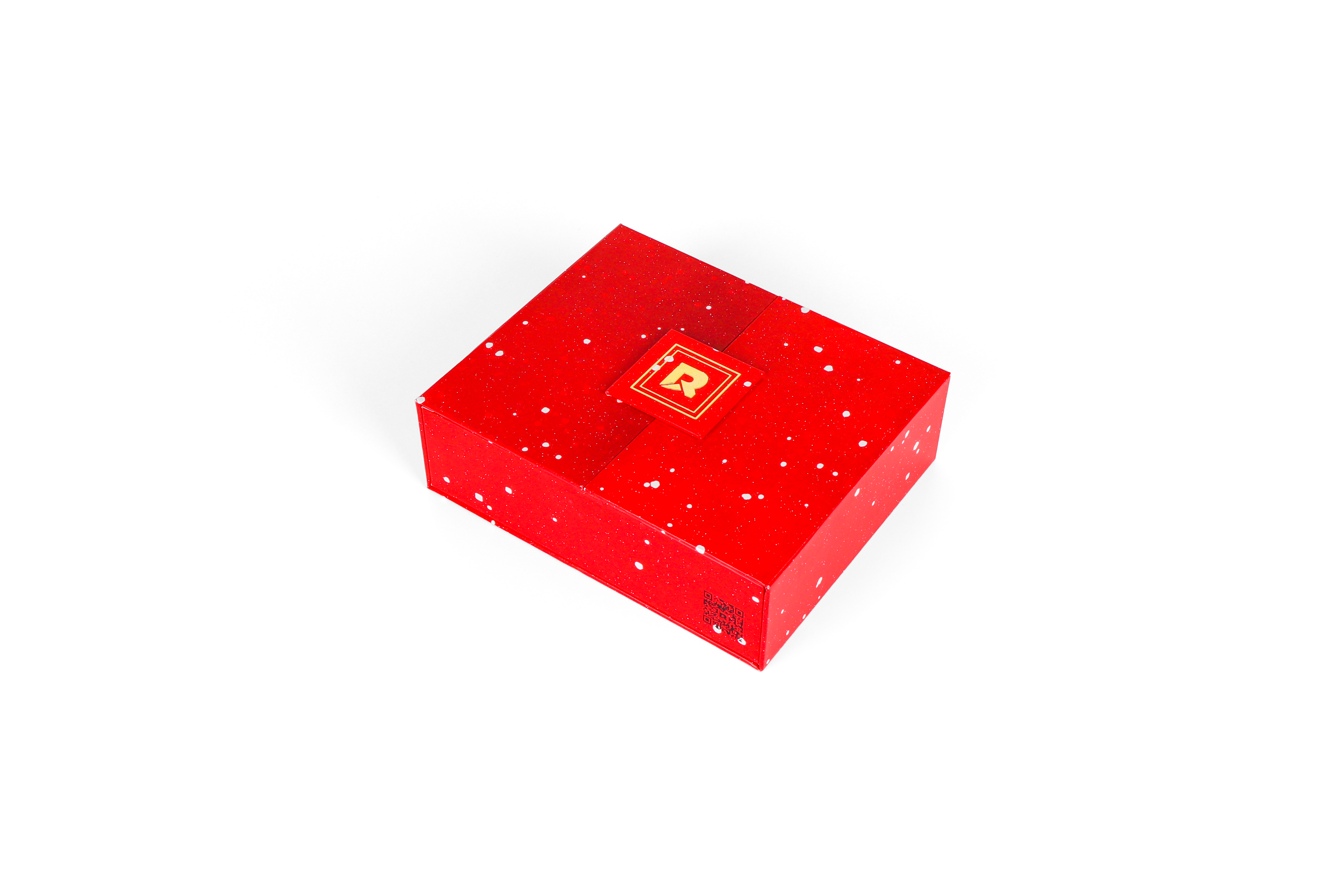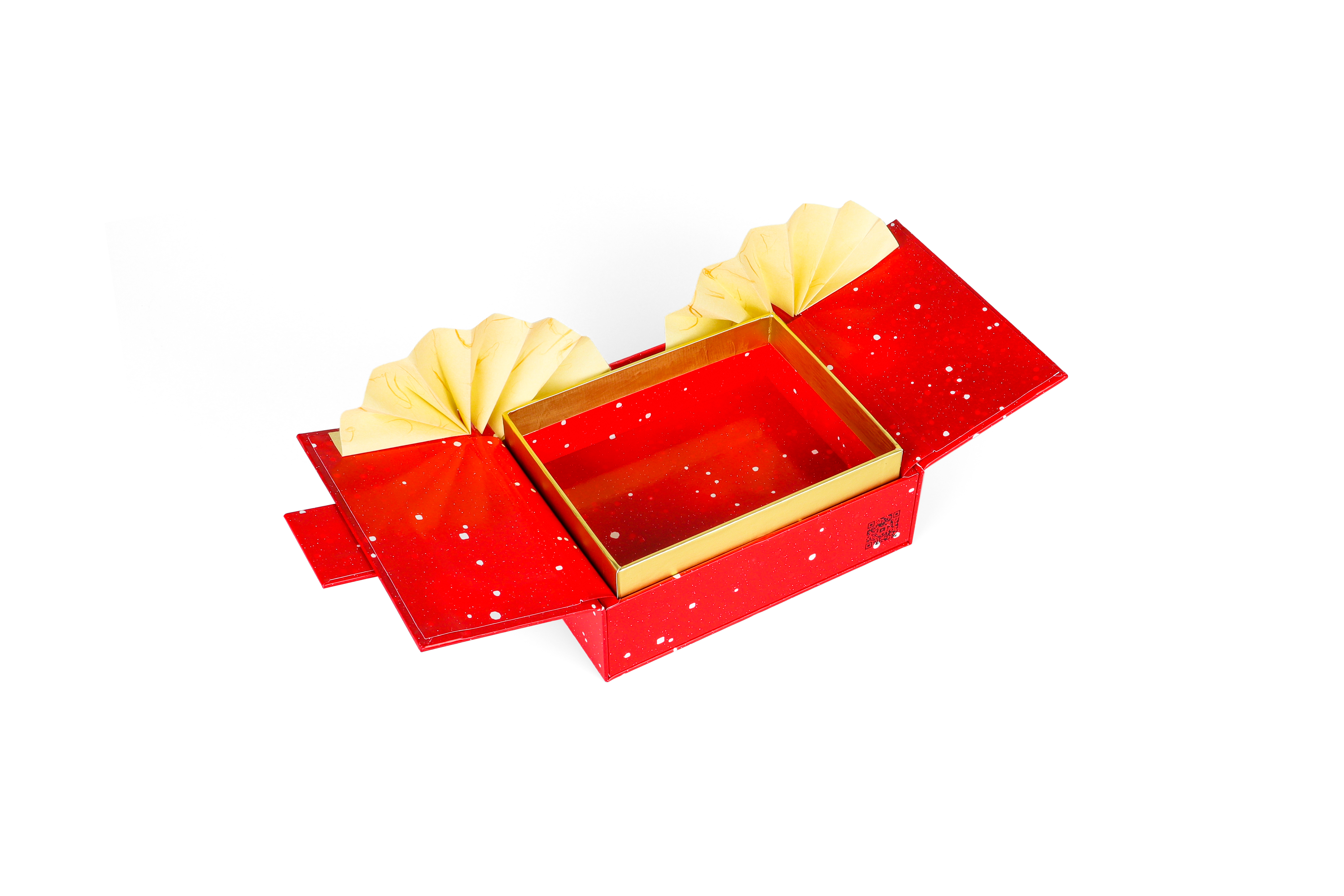 This red packaging box has white spots like stars. The golden - framed logo on top is elegant. Inside, the golden lining pairs with the red body. The lid's yellow folding - fan design is creative. It's great for gifts or products, adding charm with its unique style.
