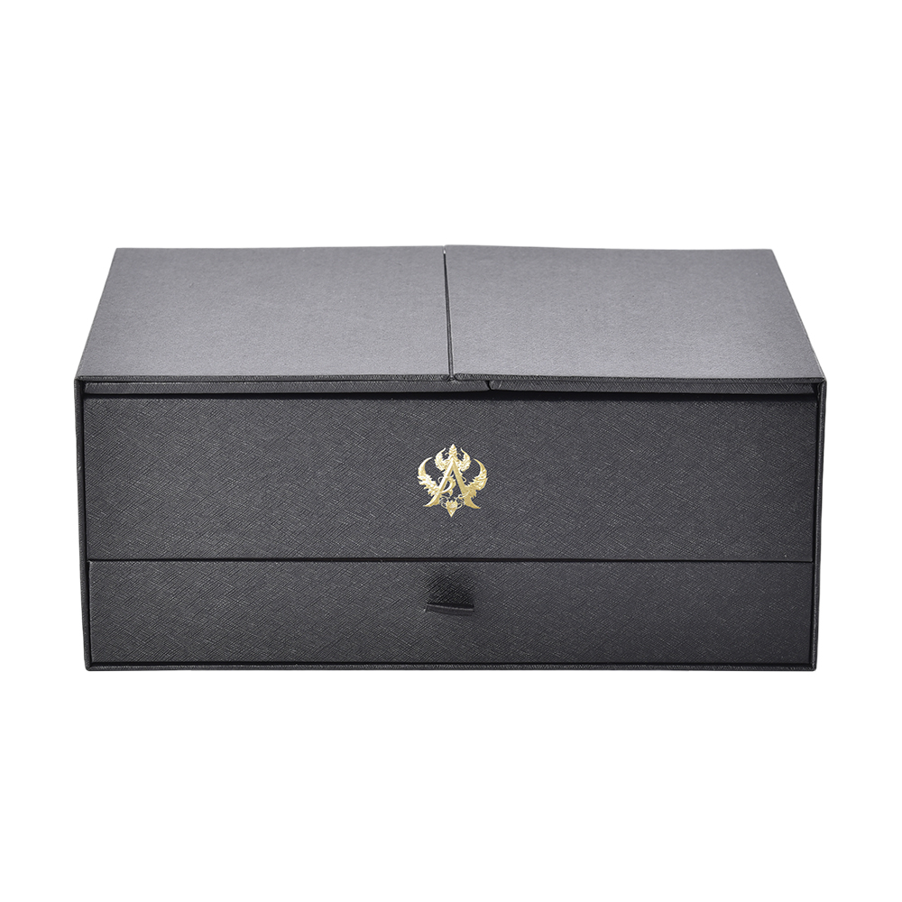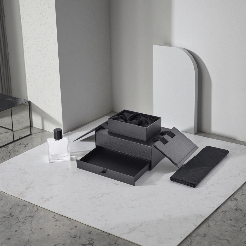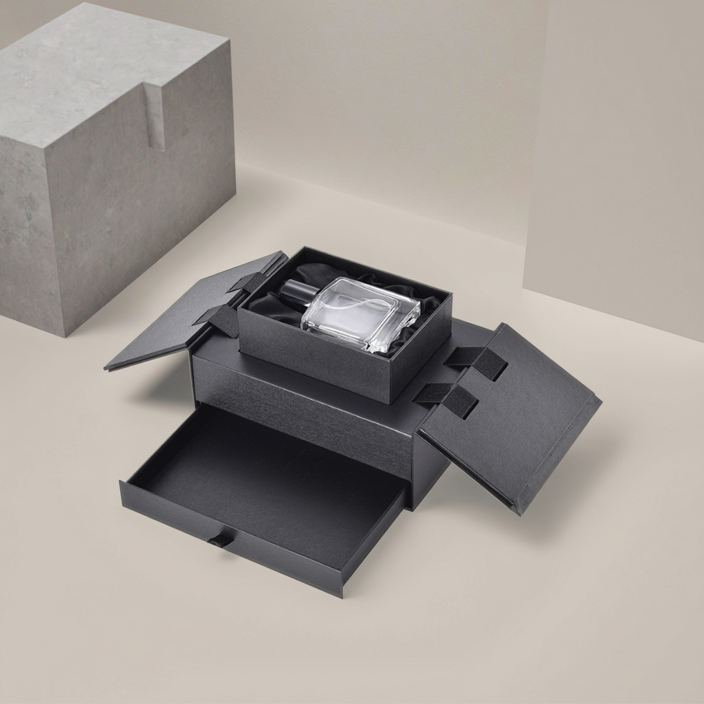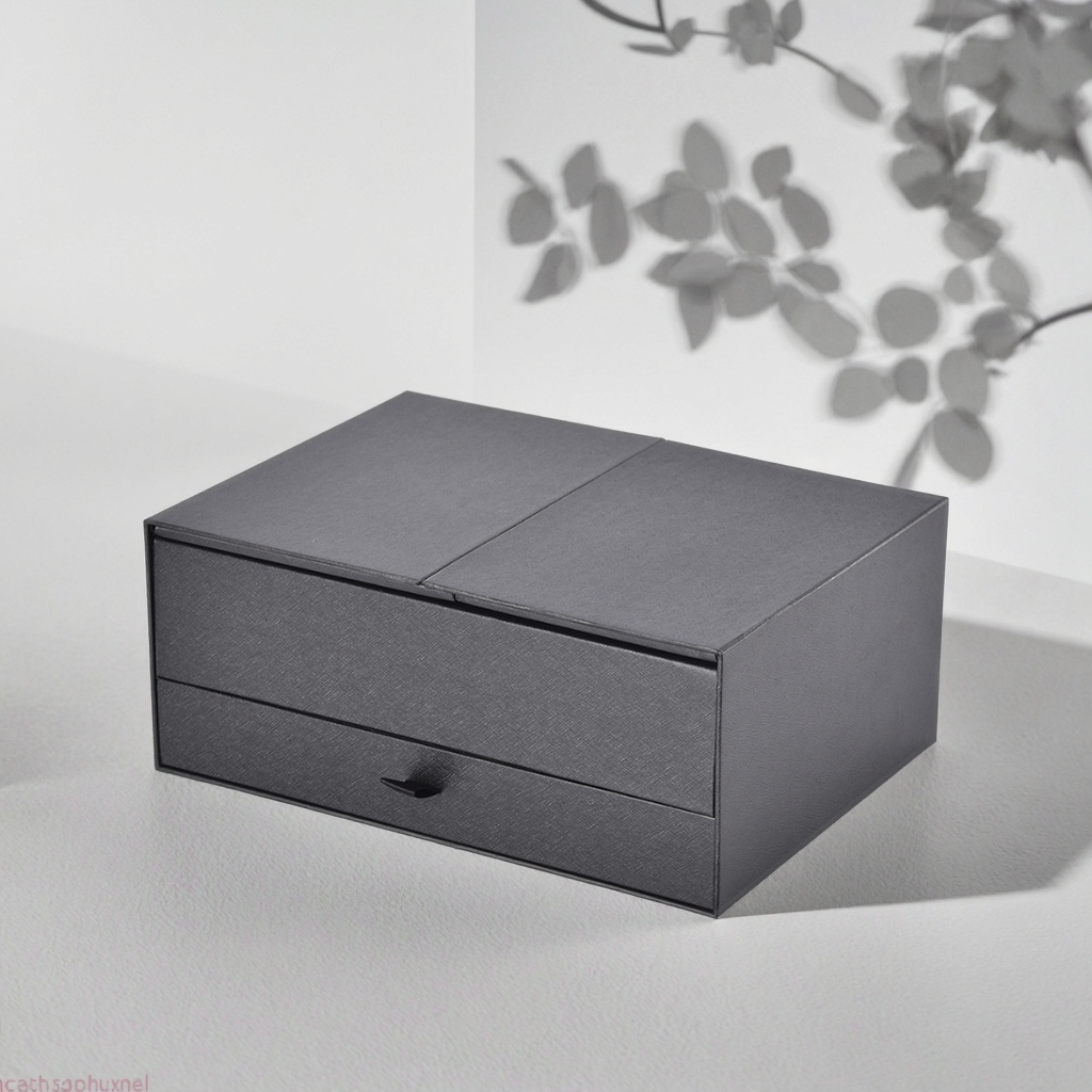 This high-end paper gift box adopts an innovative double-layer design. Sense of ceremony and practicality. The upper floor features double doors. When opened, the built-in lifting platform slowly lifts up. Combined with custom grooves, it can perfectly display perfumes or cosmetics, just like a boutique display. The lower layer is a drawer-type storage box with a large capacity, which is suitable for storing skin care products, jewelry and other accessories.