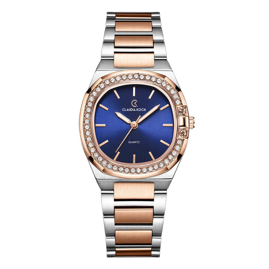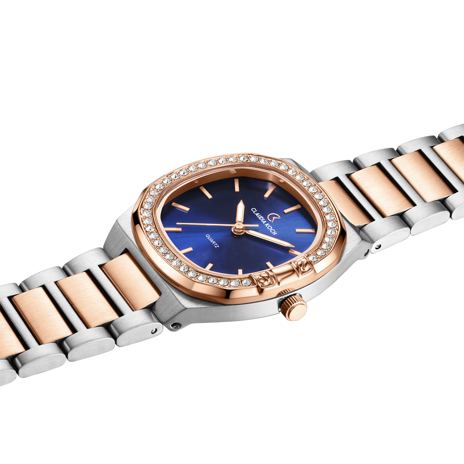 Indulge in luxury with this stunning women’s watch, featuring a slightly curved square dial adorned with shimmering stone accents. The elegant curve of the dial not only enhances comfort but also adds a unique touch of sophistication. The sparkling stones catch the light beautifully, making this timepiece a true statement piece. Perfect for elevating your formal attire or adding a touch of glamour to your everyday look, this watch combines timeless elegance with modern style.