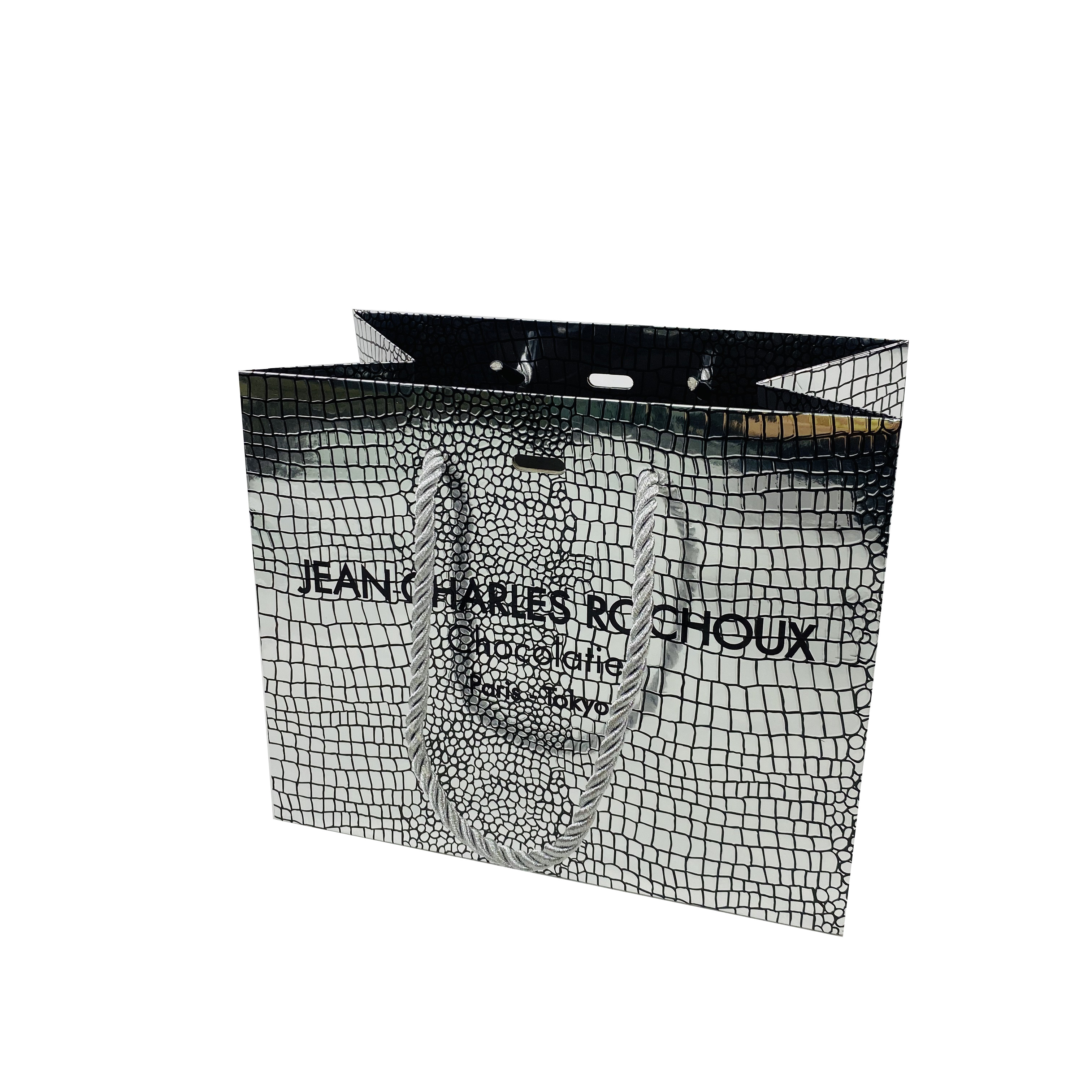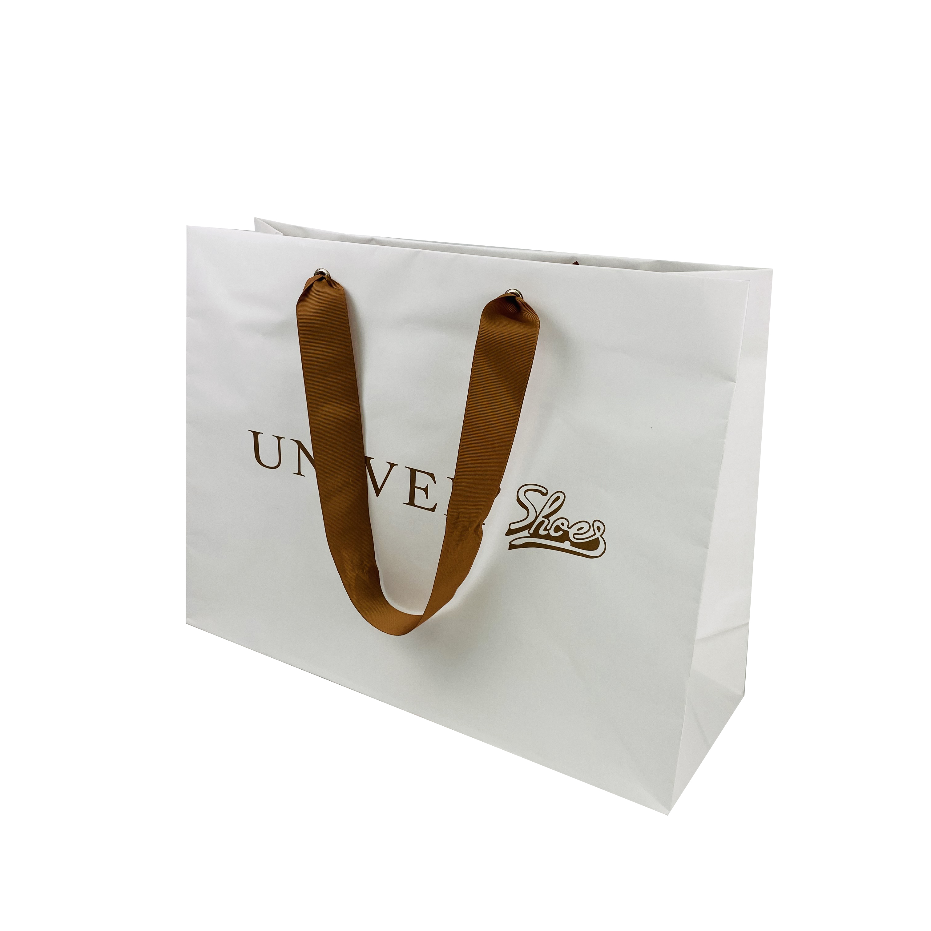 This Luxury matte laminated paper bags is for chocolate packaging. We can offer food-safe ink and our material passed heavy-metal test. The outside is water-proof and greasy-proof. Double sided satin ribbon handles was knotted and the ribbon in center can be tie to bow-knot for closure.