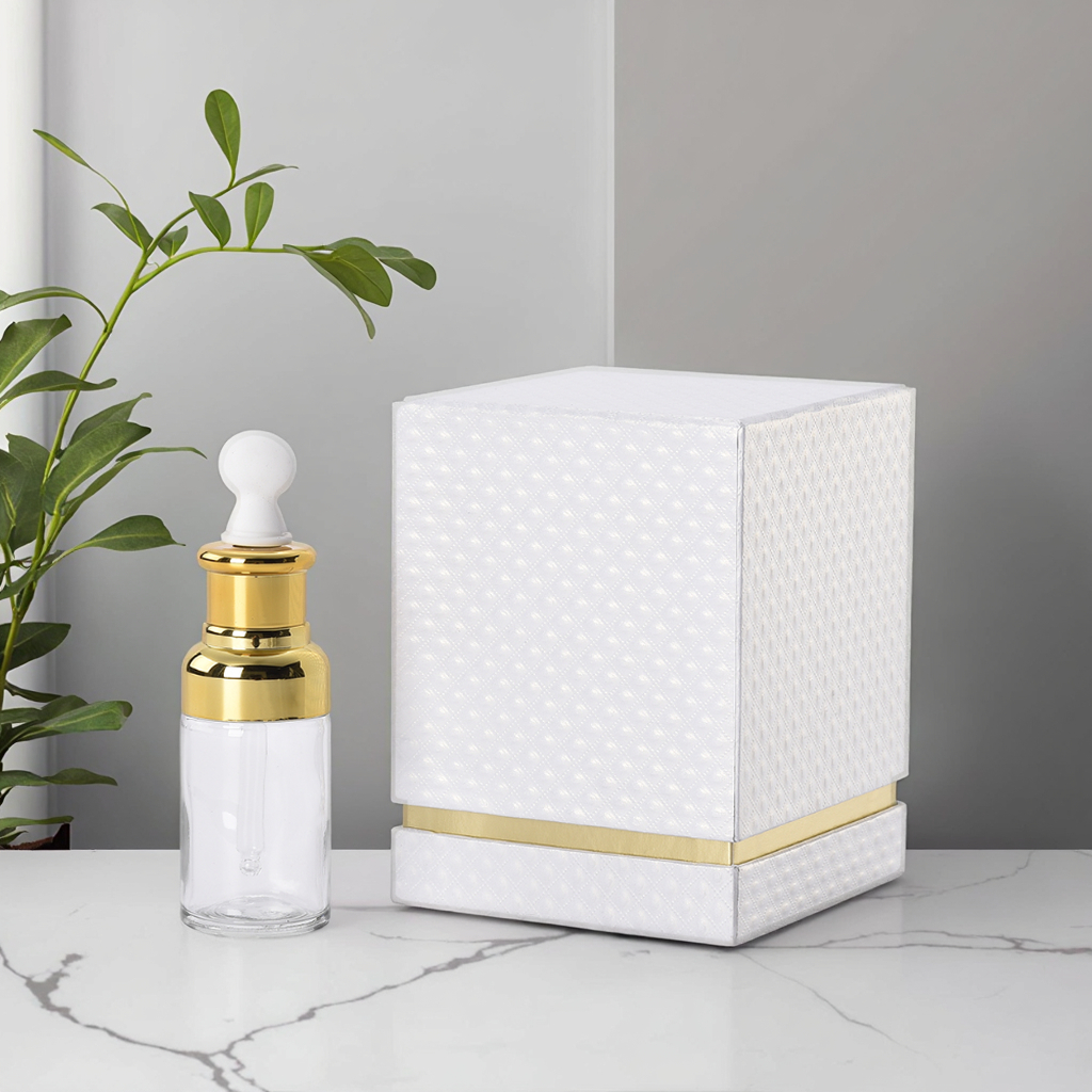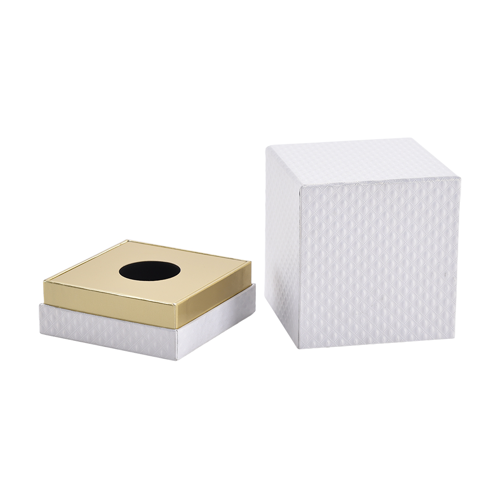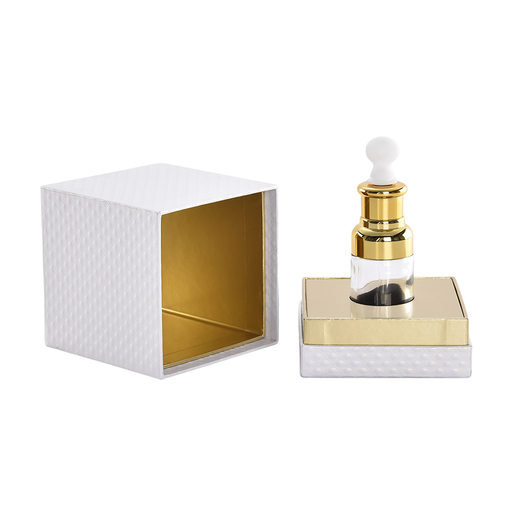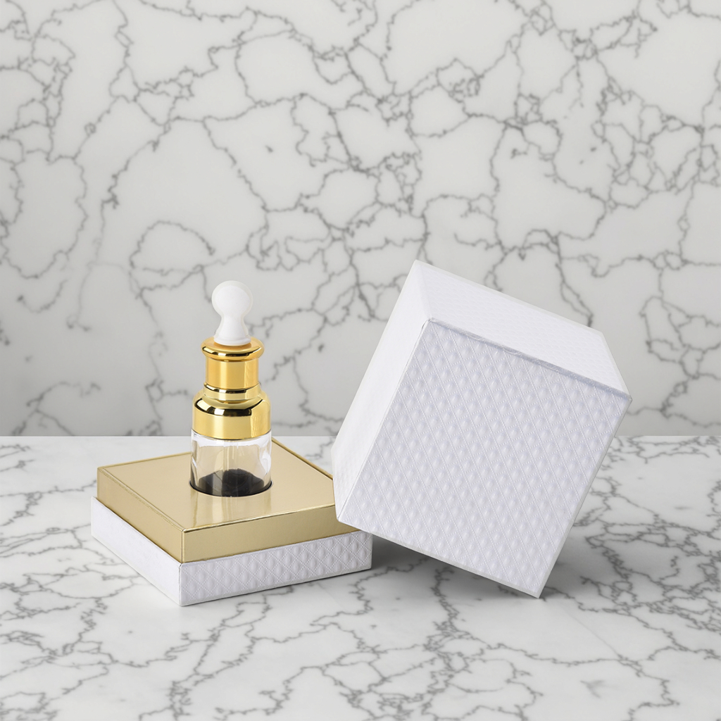 This is a high-end paper gift packaging box, featuring a separate design for the upper and lower LIDS (with lid and base). The base is equipped with custom grooves, which can firmly hold delicate items such as perfumes and cosmetics. The box body is made of thickened special paper, with a smooth surface touch. The sample in the picture has a pure white outer box with a golden inner lining, fully demonstrating a light luxury style. Supports full customization.