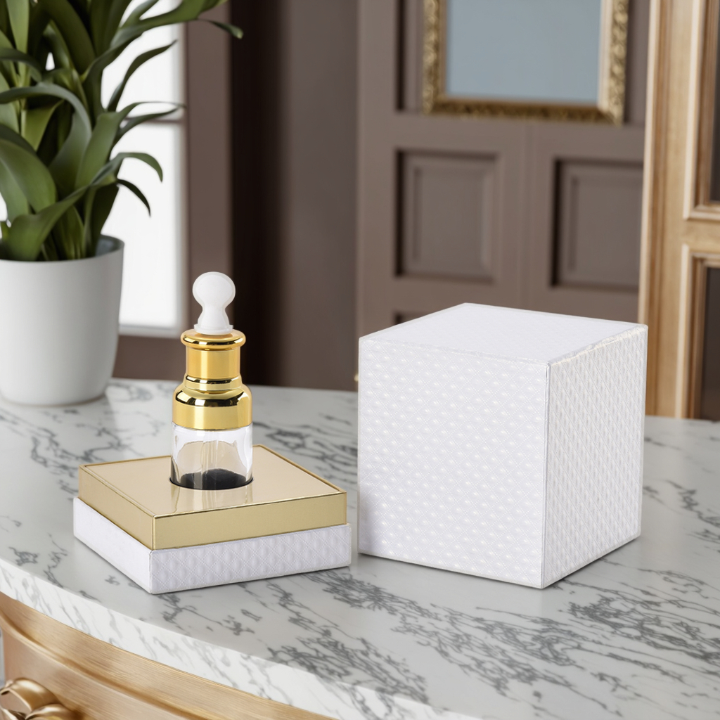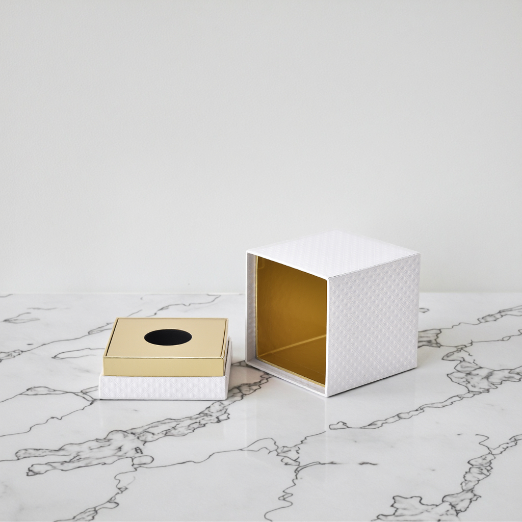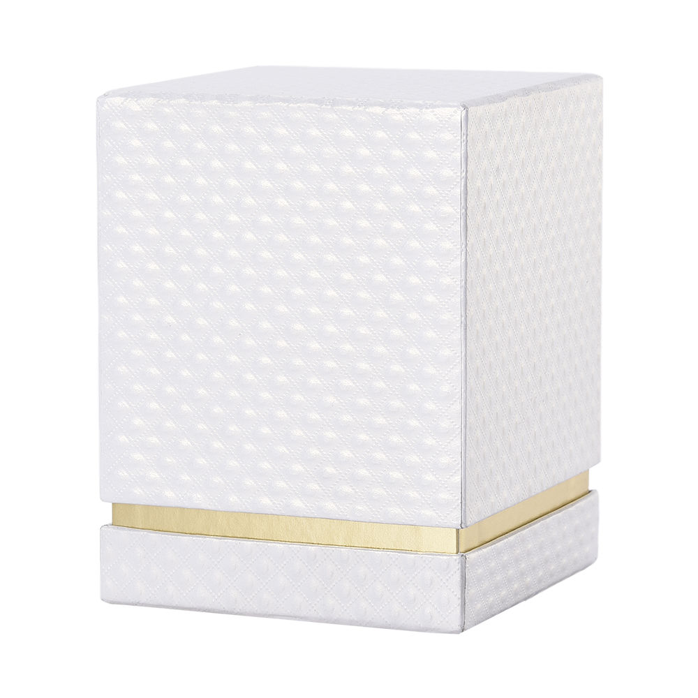 This is a high-end paper gift packaging box, featuring a separate design for the upper and lower LIDS (with lid and base). The base is equipped with custom grooves, which can firmly hold delicate items such as perfumes and cosmetics. The box body is made of thickened special paper, with a smooth surface touch. The sample in the picture has a pure white outer box with a golden inner lining, fully demonstrating a light luxury style. Supports full customization.