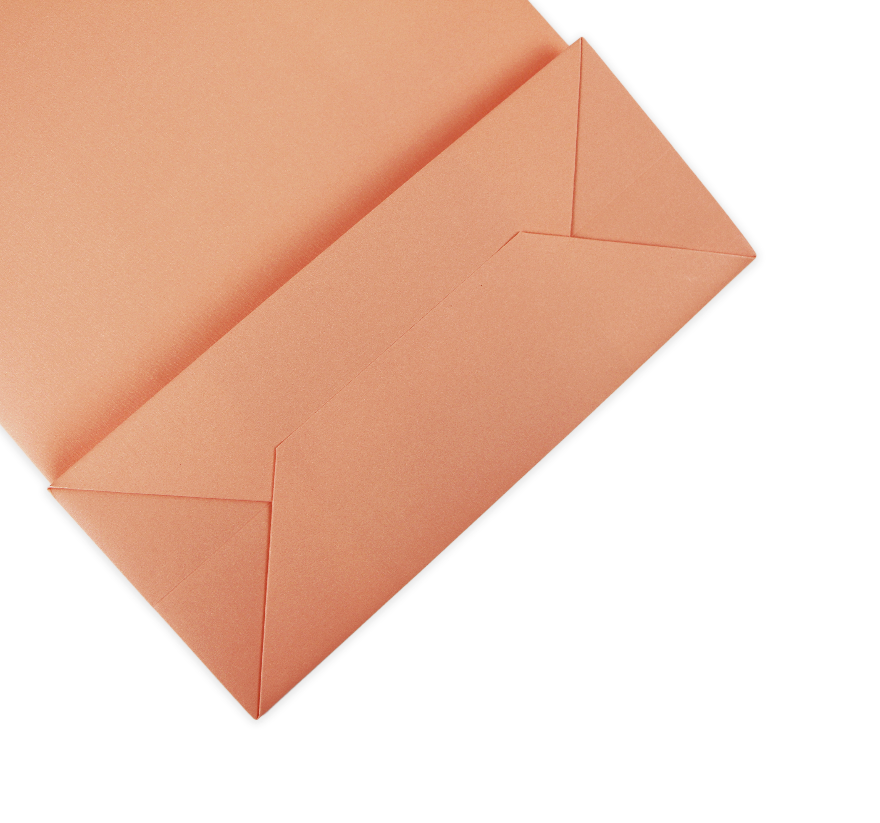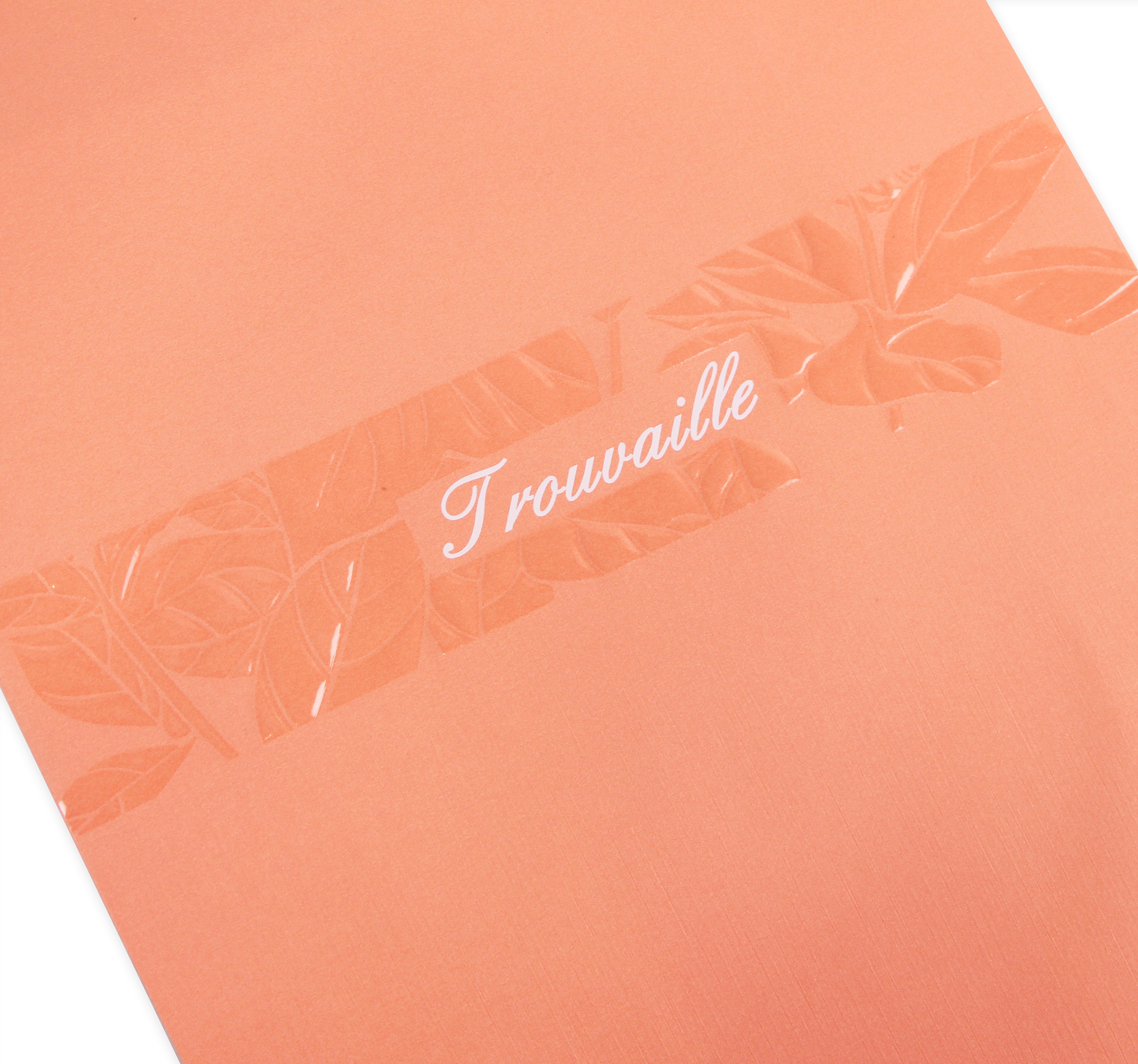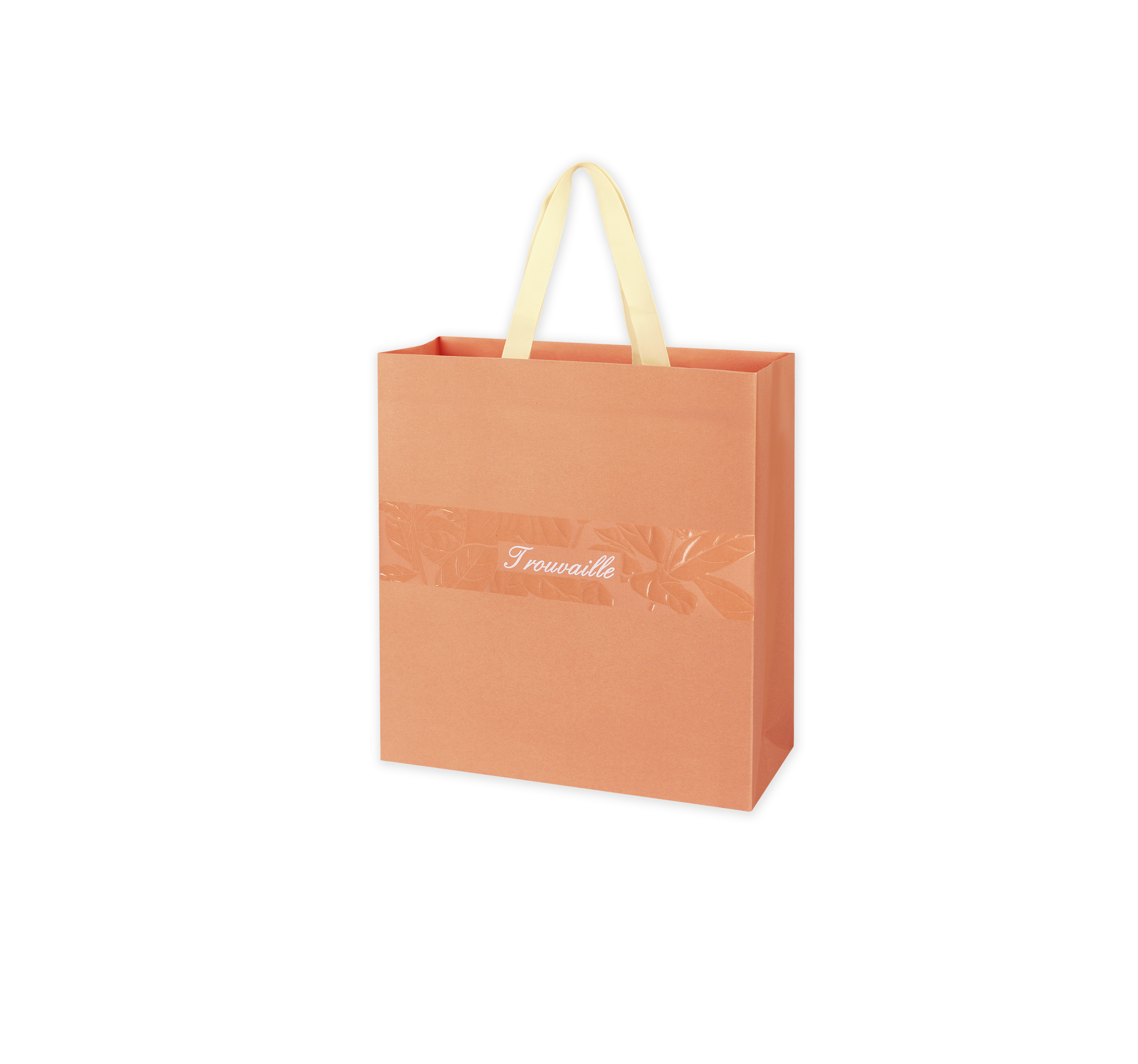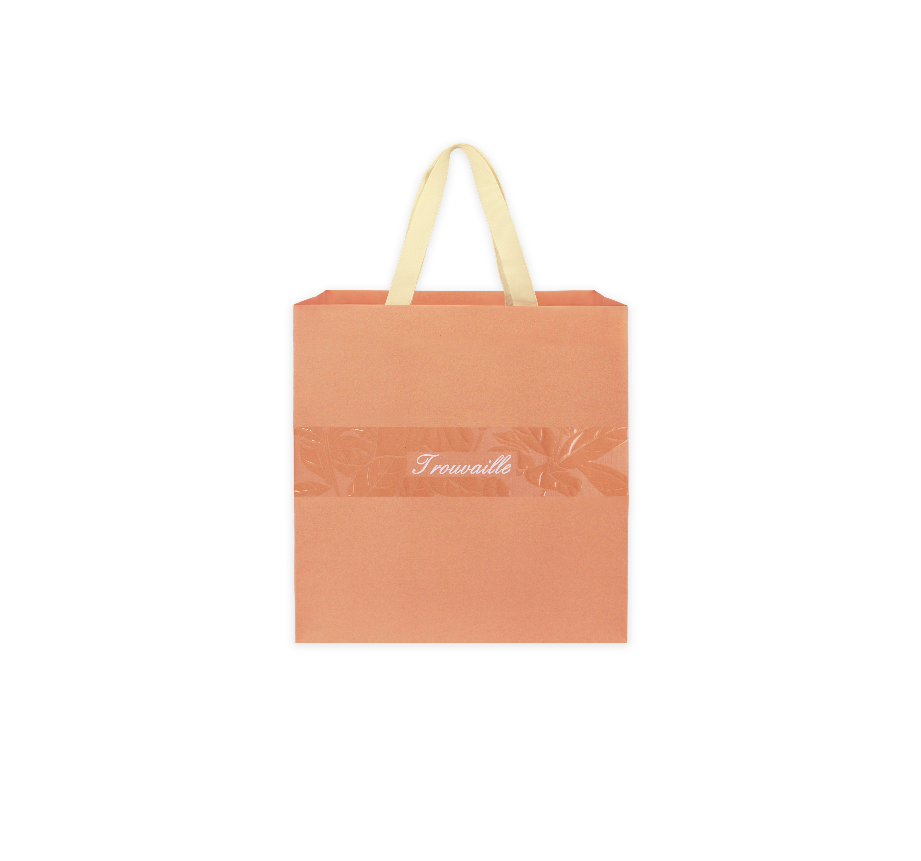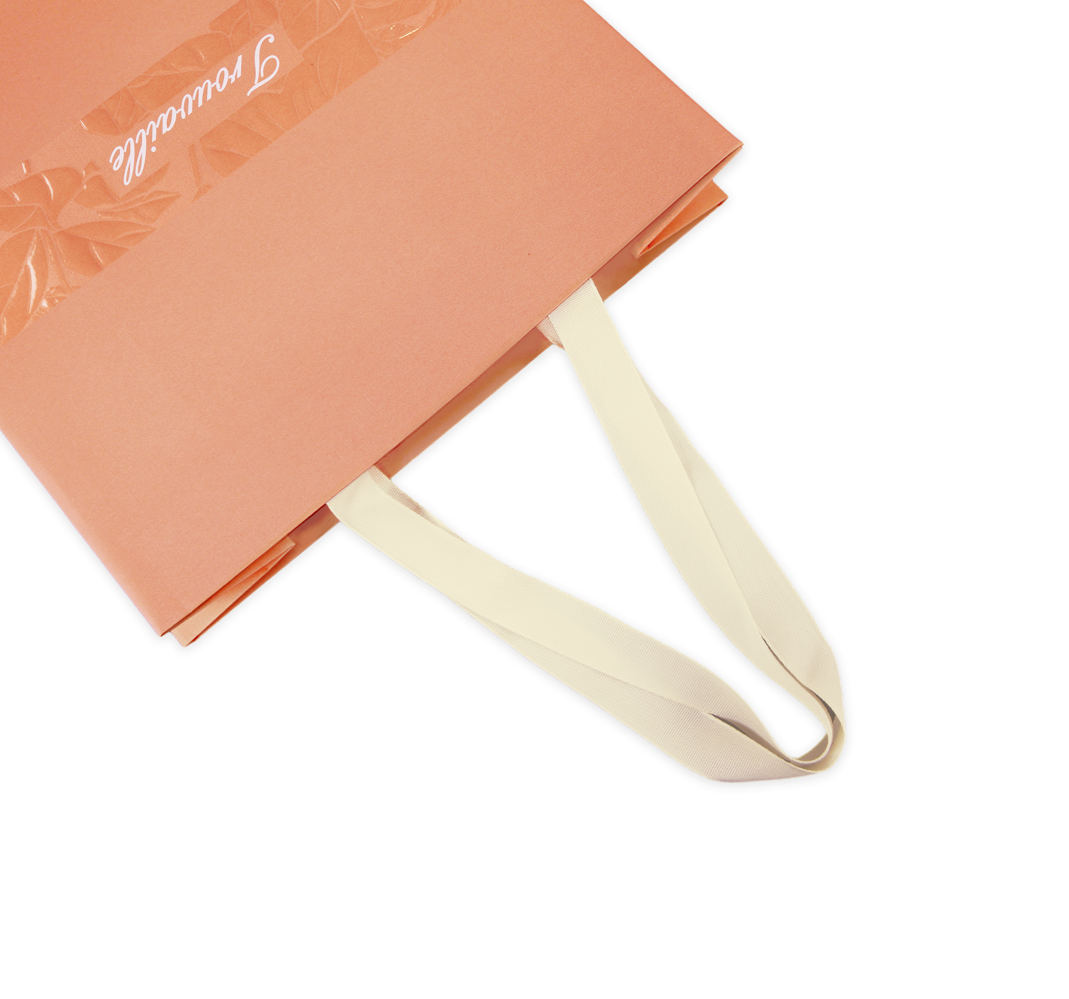 White kraft paper with 40% PCW, premium hot stamp silver logo, paper ribbon glued on top.