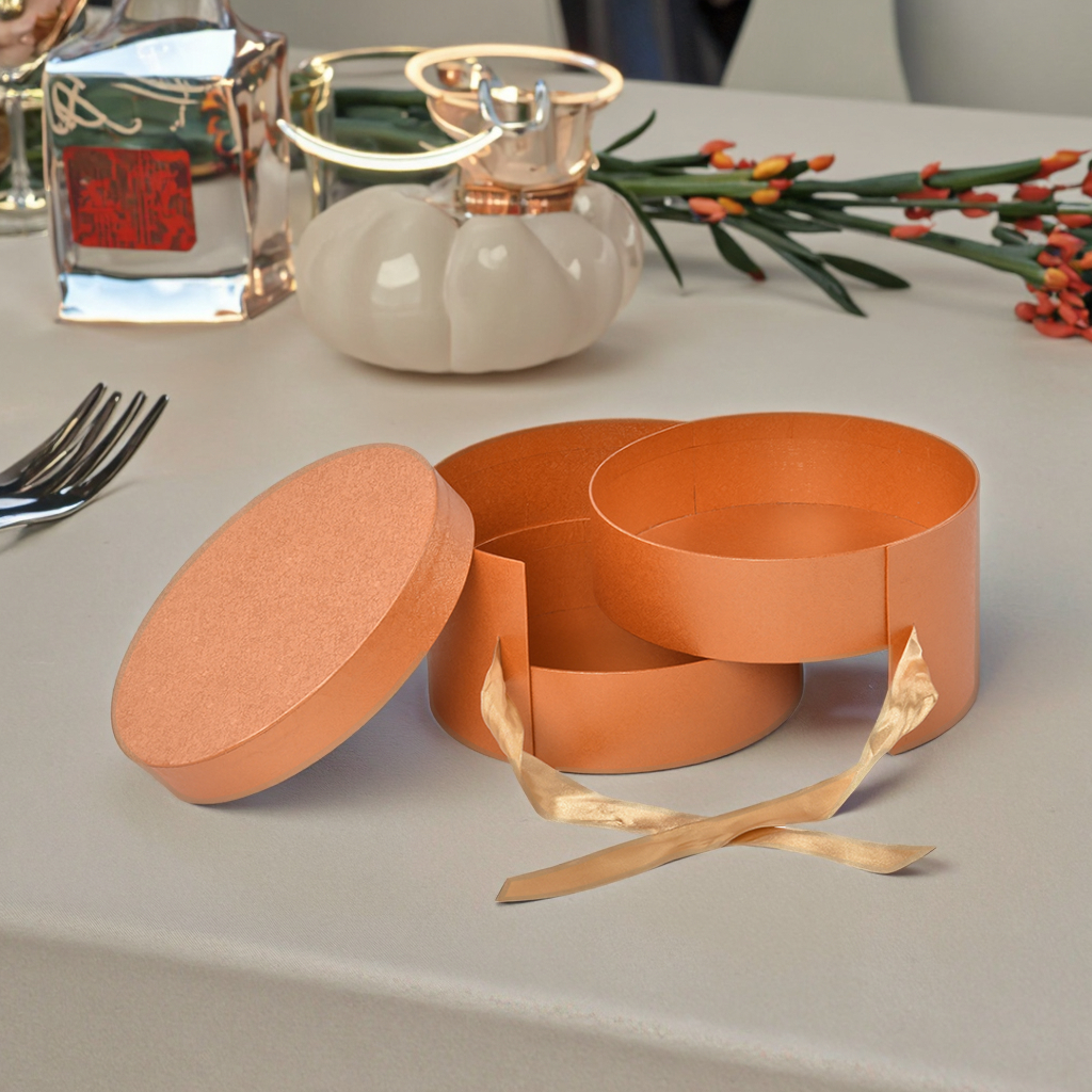 This high-end circular paper gift box adopts a double-layer rotating structure. Elegant design and practical functions bring a surprising unboxing experience. The box body is made of thickened special cardboard, with a fine touch coating on the surface. It is sturdy, durable and has strong load-bearing capacity, perfectly protecting the precious gifts inside the box.