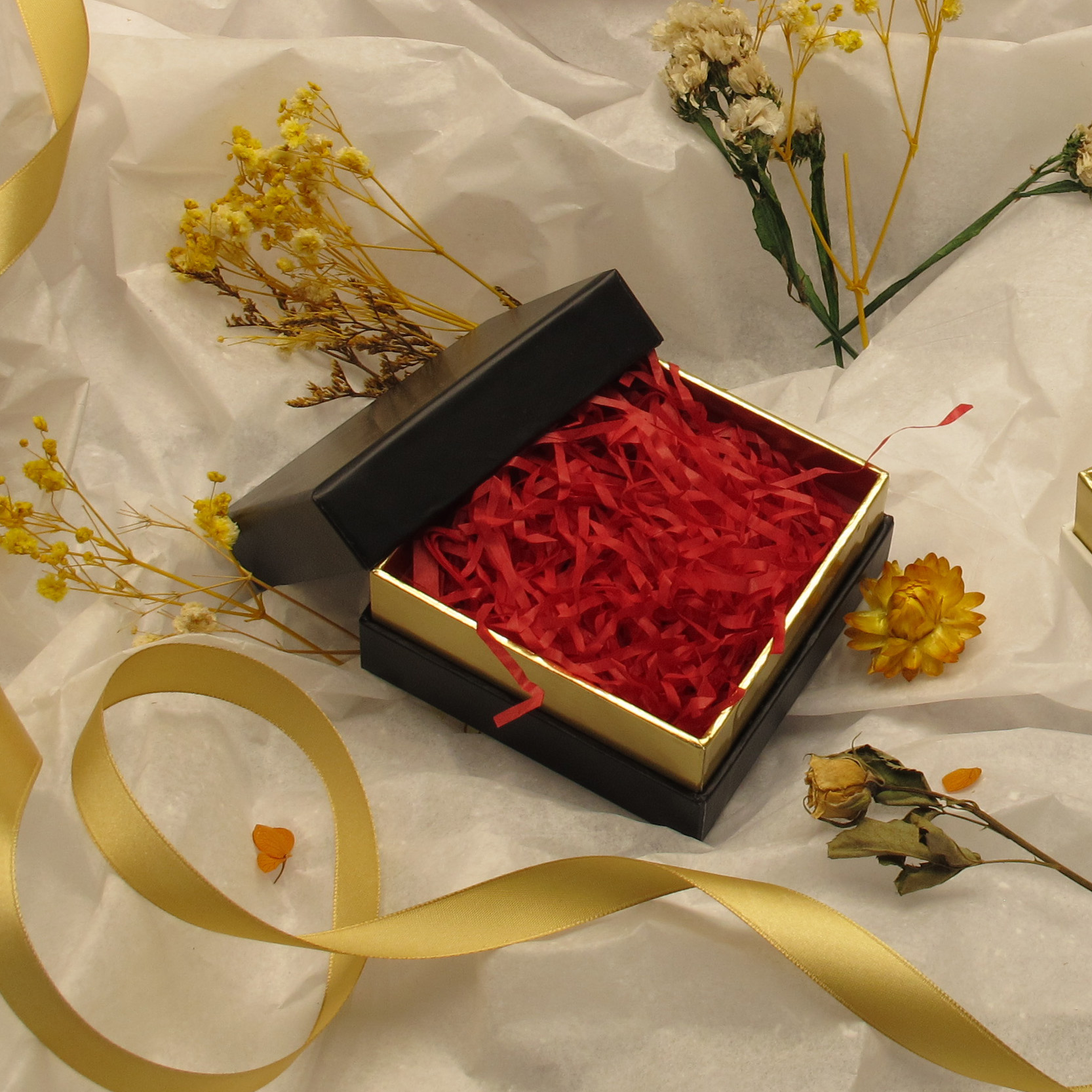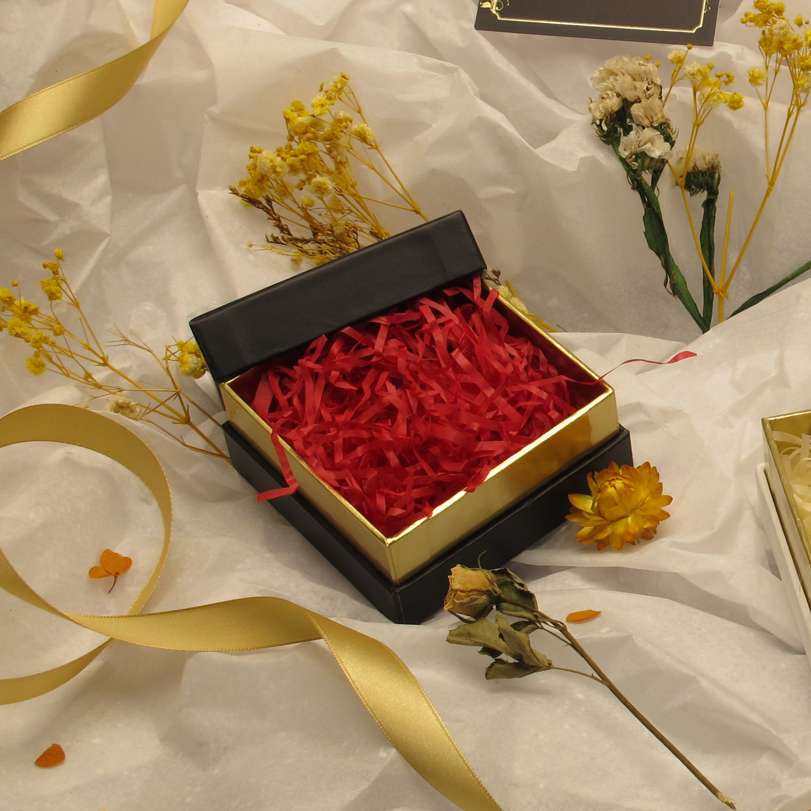 This high-end square packaging box adopts the classic top and bottom box design. The box body is exquisitely crafted from special cardboard, with the edges outlined by gold-embossed borders, exuding an air of luxury. The center of the box surface can be customized with an exclusive gold-embossed LOGO or text, which shines brightly on the solid color background, creating an unforgettable brand impression.