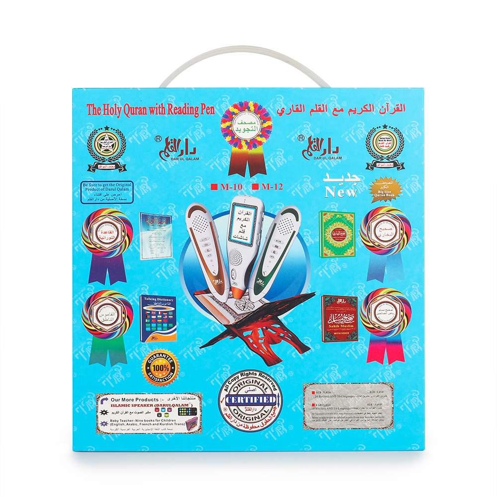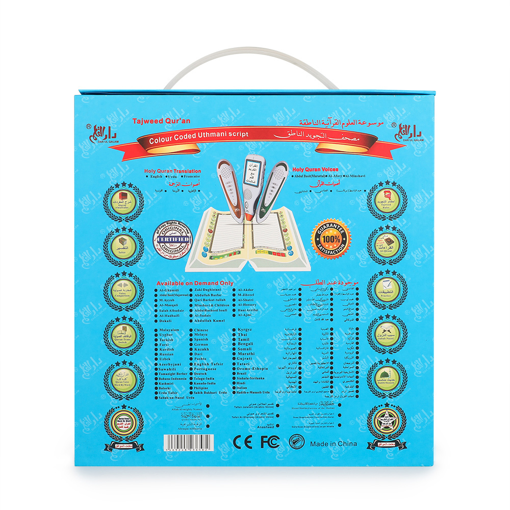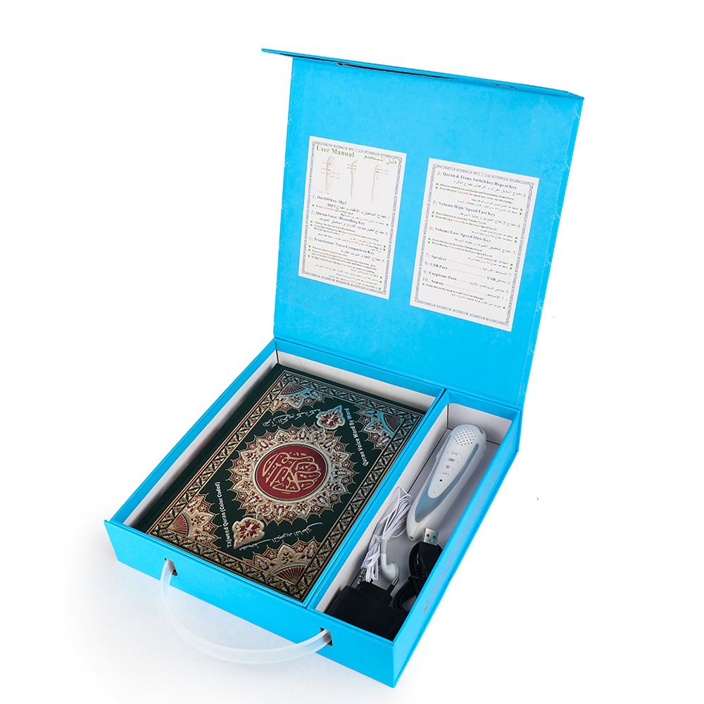 Advanced Settings: Quran reading pen built-in a speaker, a rechargeable Li-battery, an 4GB/8GB/16GB/32GB TF card and a USB port to connect to PC.