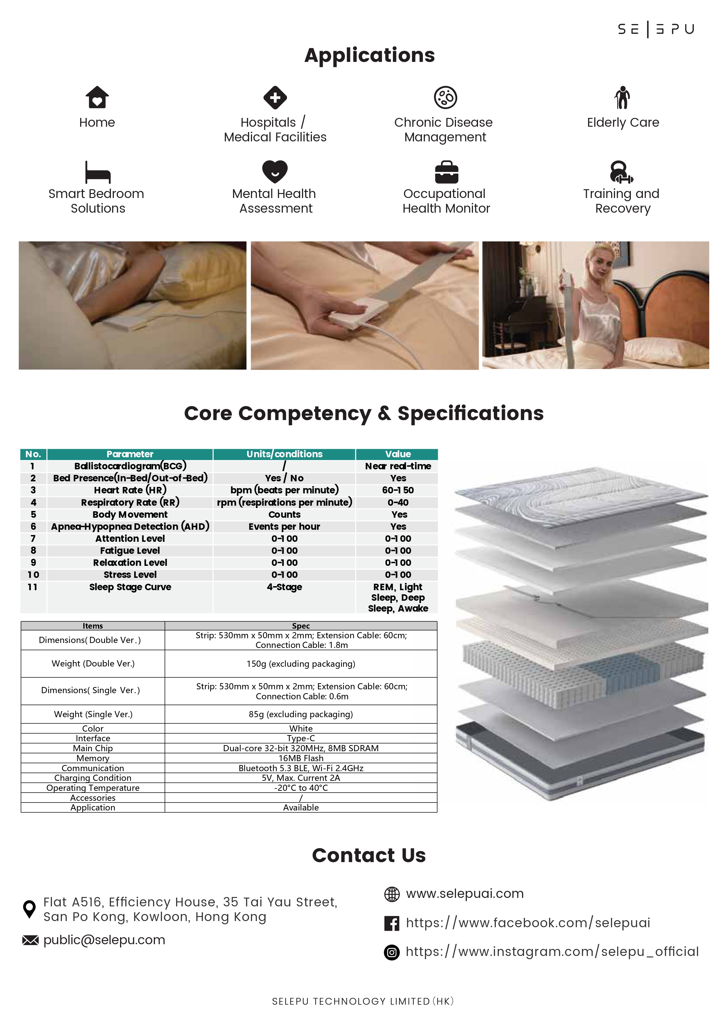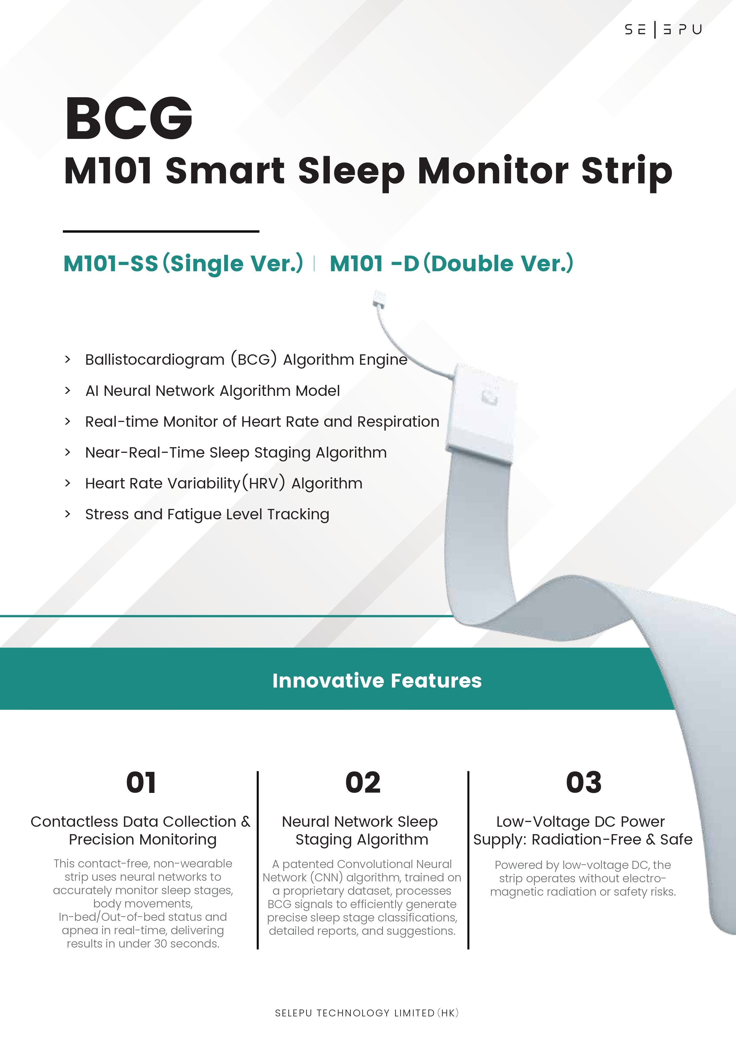 An advanced non-wearable and contactless monitoring tracker. Based on a BCG (Ballistocardiogram) neural network model, it enables real-time detection of user’s In-Bed/Out-of-Bed Status, heart rate, respiration and body movement, while also supporting sleep stage analysis and stress index monitoring. The product incorporates PVDF nanoscale piezoelectric film technology, with sensors seamlessly embedded into the mattress comfort layer. By integrating AI neural network algorithms and large model technology, it successfully addresses the critical challenges of real-time, accurate monitoring.
