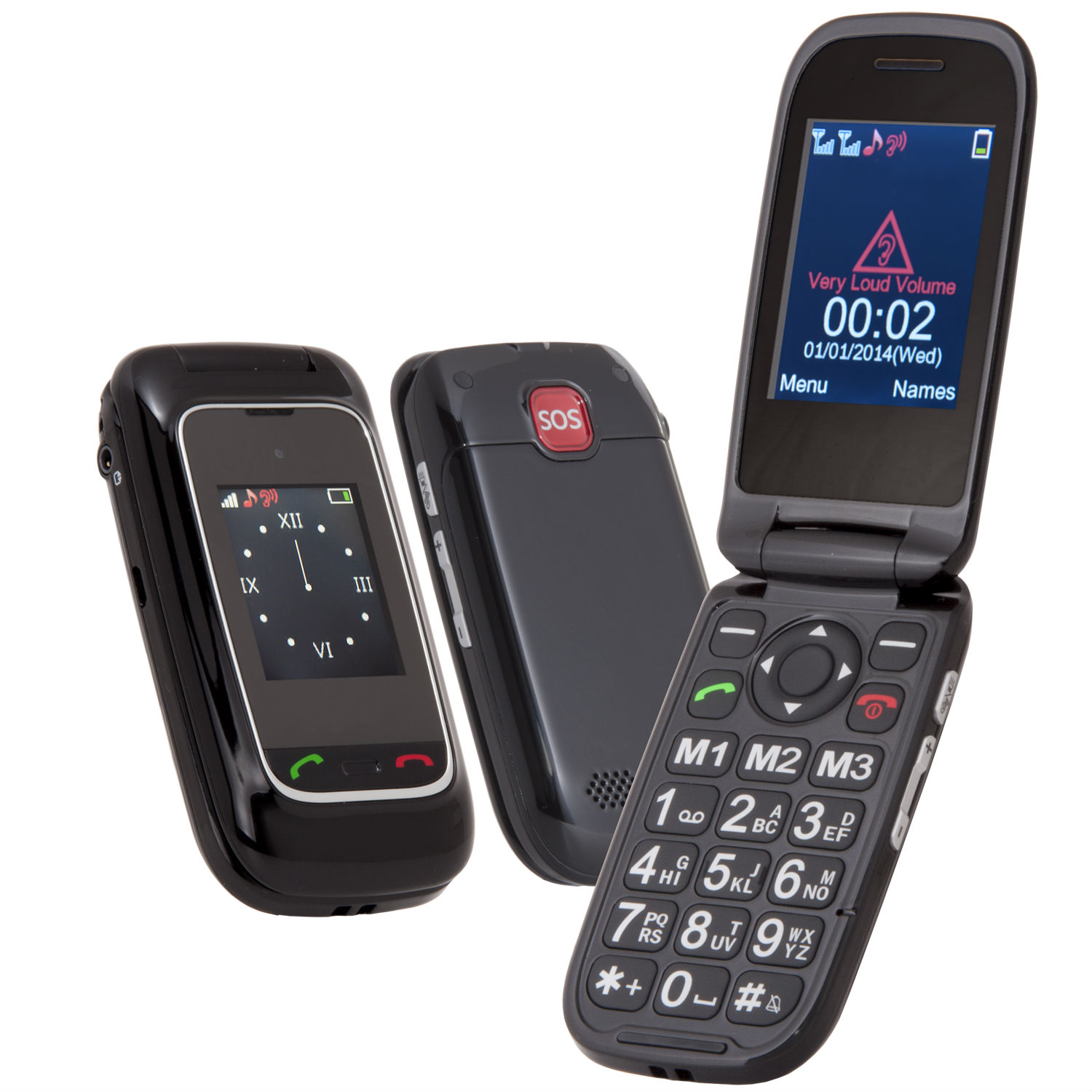 2G/3G GSM, WCDMA Dual TFT LCD color display - 2.4"/1.7" SOS button for Emergency call +35dB Amplifier receiver volume Hearing Aid compatible, M4/T4 Camera 0.3Mega-pixels (Option : 2Mega-pixels) Loud ringer 12 Languages talking keypad 10 Numbers talking name caller ID LED Torch, Bluetooth Charging cradle