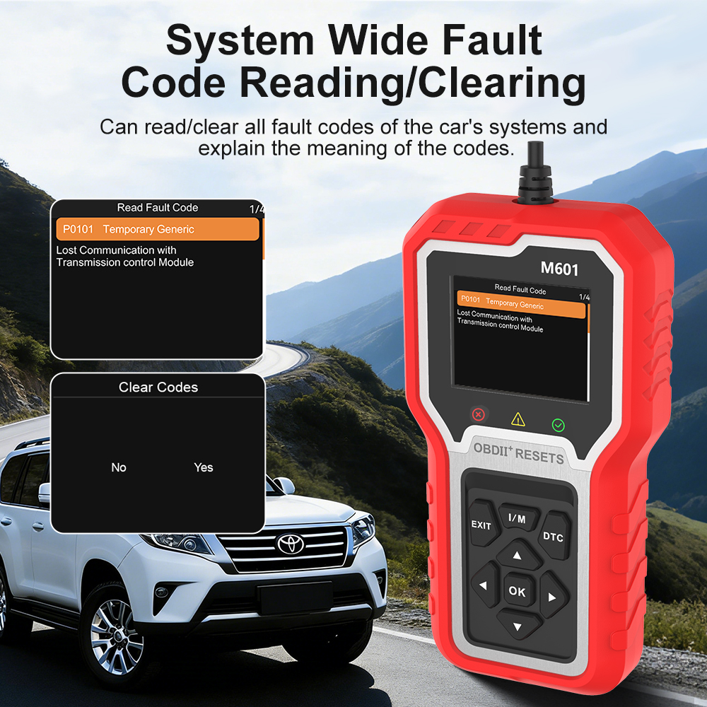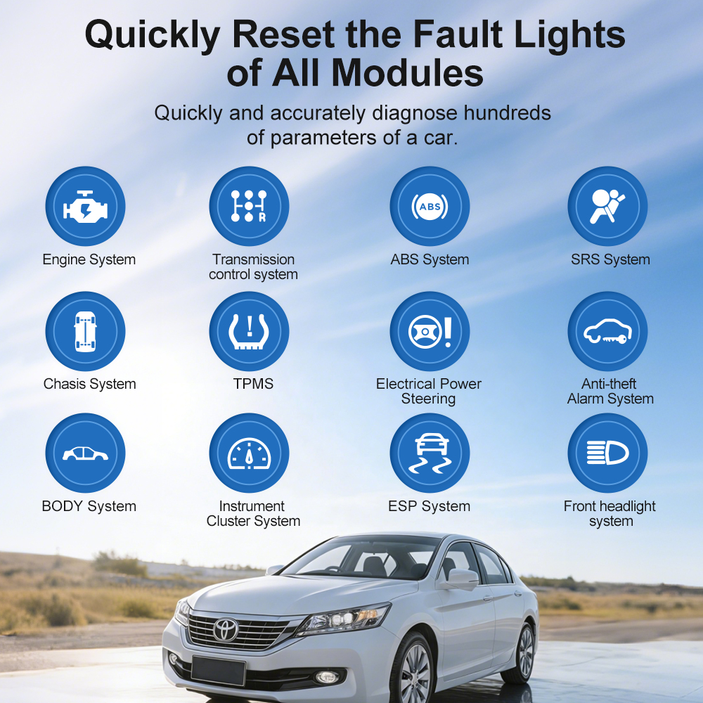 This advanced OBD2 diagnostic tool offers comprehensive vehicle system coverage, including engine system diagnosis, transmission control, ABS, airbag, body control, chassis control, and speaker control systems. It features essential functions like reading/clearing fault codes, real-time data streaming, system upgrade capability, data playback, and cloud printing, all displayed on a clear 2.8-inch color screen.