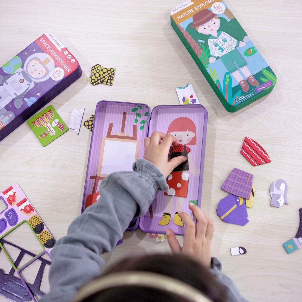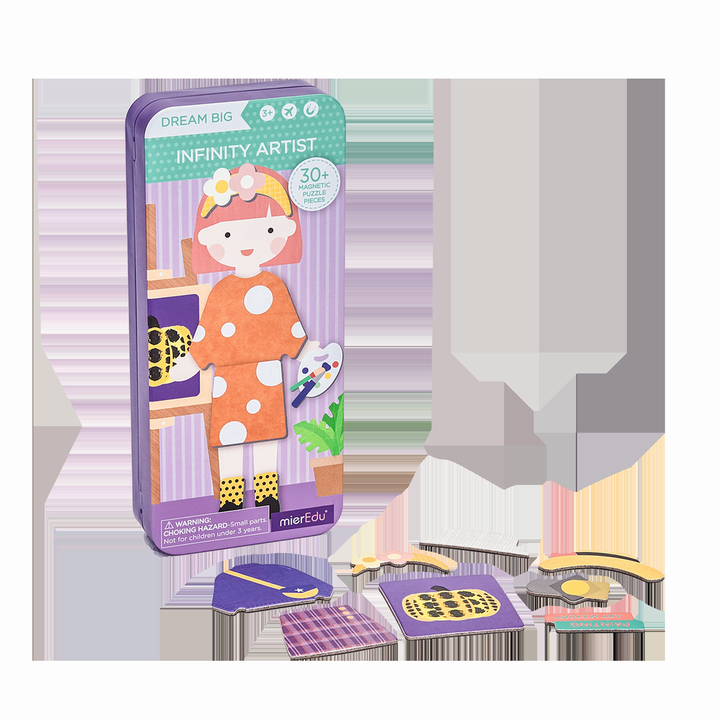 Infinite Artists-Inspired by Yayoi Kusama, Marie Curie, Neil Alden Armstrong and Charles Robert Darwin, these magnetic boxes are designed to encourage kids to dream big! With the Infinity Artist set, they can follow in their favorite artist's footsteps and create their own masterpieces. Each set includes two scenes and more than 30 magnetic puzzle pieces, where they can dress up their character and invent their own stories. Using touch and feel, kids can play with both hands to stimulate their left and right brain development.