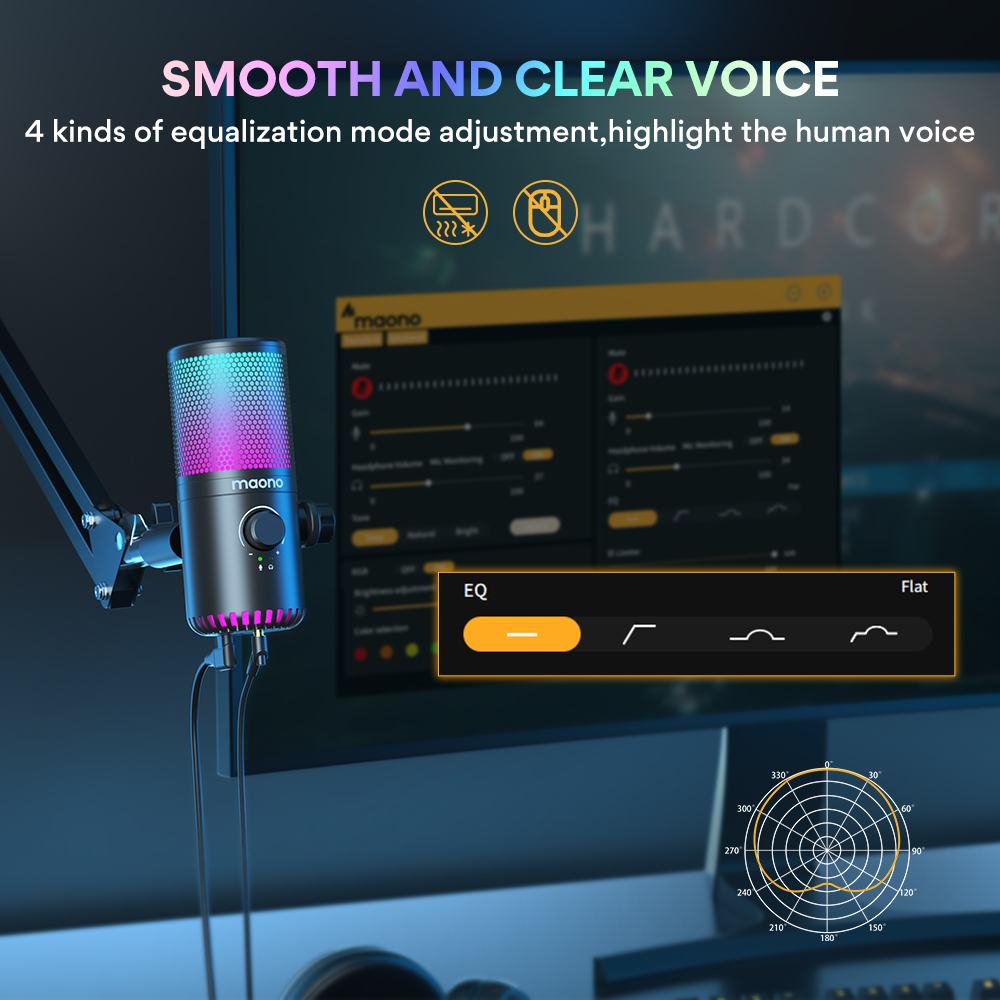 A real plug&play RGB gaming microphone specially designed for gamers, which can perfectly work with Maono-link software, and fit with three-in-one features controls for mute, microphone gain, and headphone volume. Also, the DM30 RGB microphone adds a carnival atmosphere with light-up computer setups, putting you in the fierce game arena.