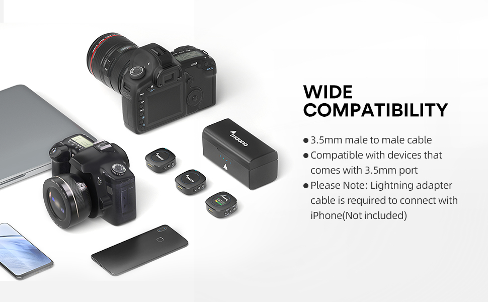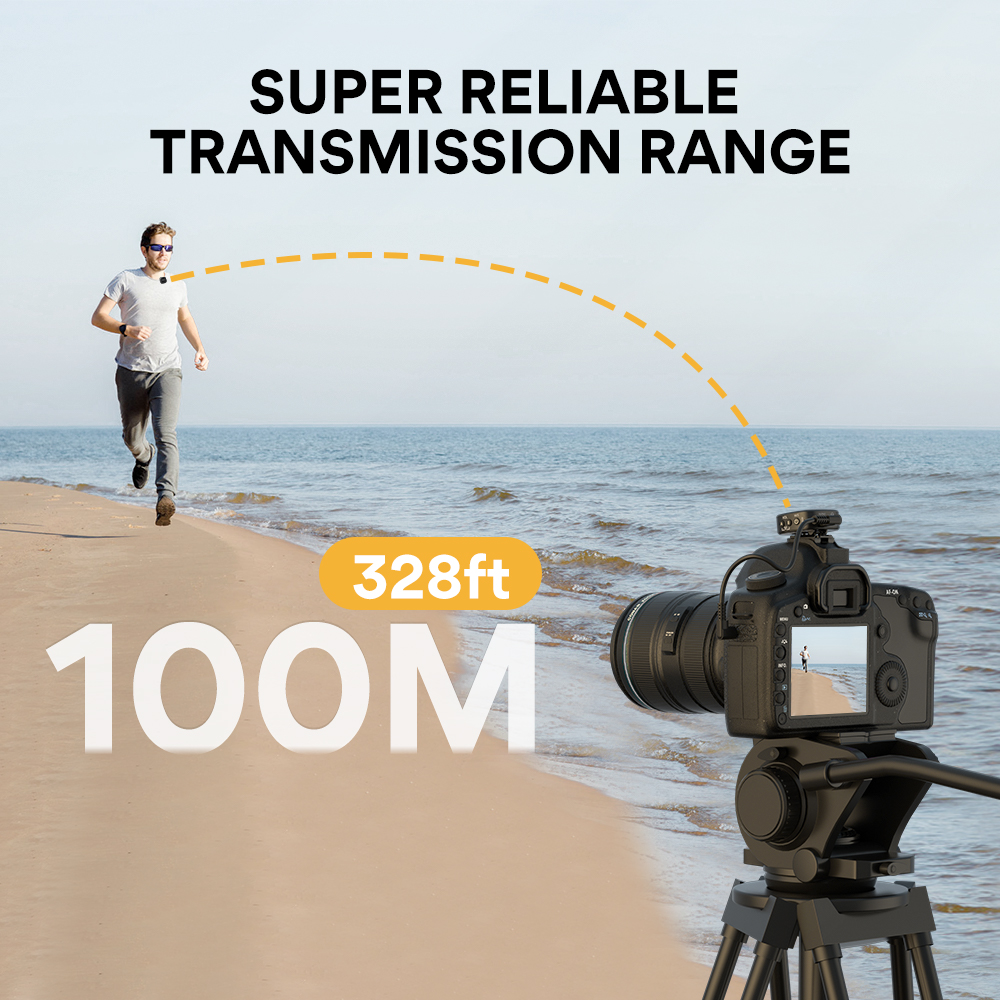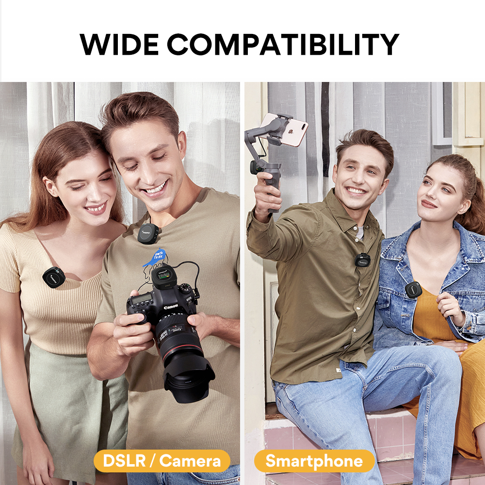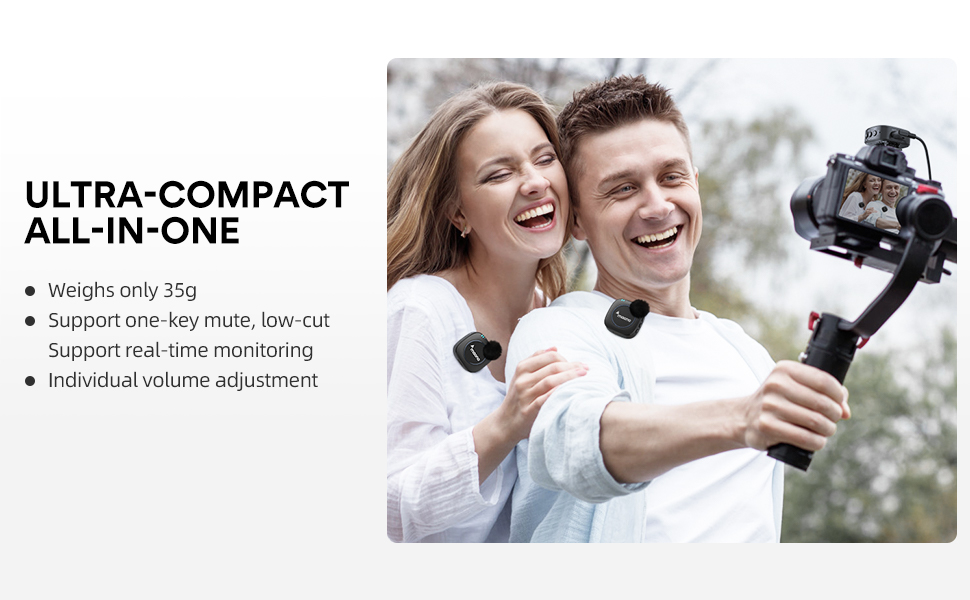 Ultra-Compact and Plug and Play: The transmitter is only 1.2 ounces each, and the receiver is only 1.3 ounces. You won't feel the weight if you wear it directly or use the wired lapel microphone included in the package. It only takes 2 seconds to auto-match after turning on the receiver and transmitter. A carrying bag is included in the package for portability and protection equipment