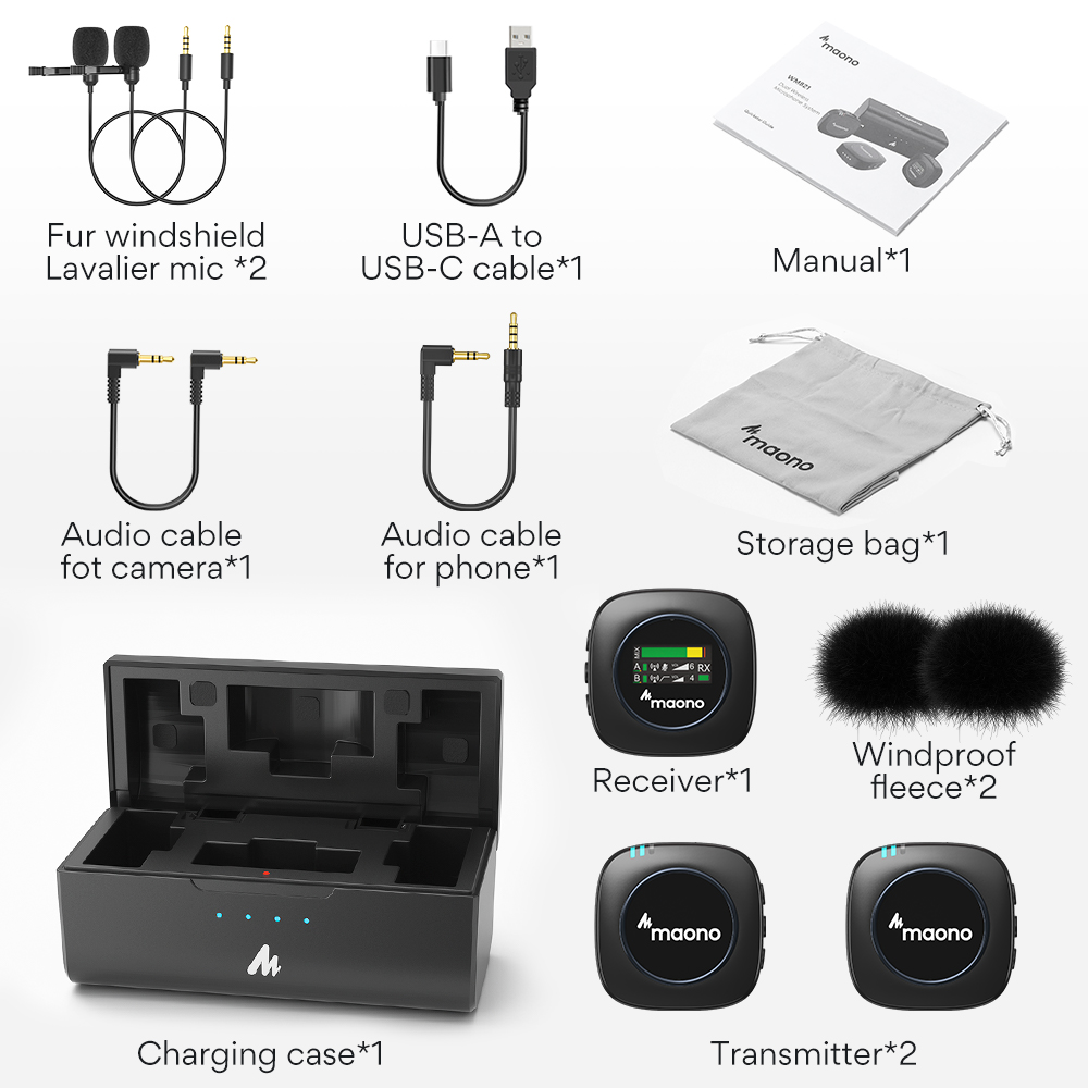 Packing list and Warranty: 1x Charging Case, 2x Transmitter, 1x Receiver, 1x 1 type-C Charging Cable, 2x Lavalier Microphone, 2x 3.5mm Audio Cale, 2x Fur Windshield, 1x Carrying Bag, 1x User Manual. For a better user experience, we provide a 12-month warranty and 24/7 online customer service
