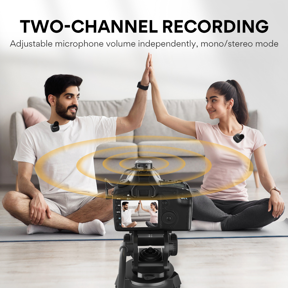 Support Recording for Two People, Free to Select Stereo or Mono Mode: It comes with two transmitters for recording the voices of two people simultaneously which is super suitable for interviews, wedding vlogs, couples recording, live streaming, etc. You can also use a single microphone for vlogging, YouTube content creation, online teaching, etc. WM821 Lavalier microphones also support one-key mute, zero-latency monitoring, and low cut for more occasions.