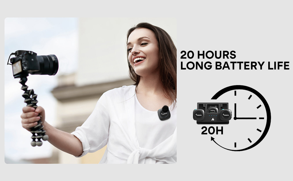 Super Long and Stable Transmission Range, Good for Outdoor Activities: Up to 328ft transmission range under normal conditions and 400ft in an open environment with no obstacles. Free your hands and move around freely. In-built rechargeable batteries and external charging box that lasts up to 20 hours. It allows you to work outside all day without running out of power