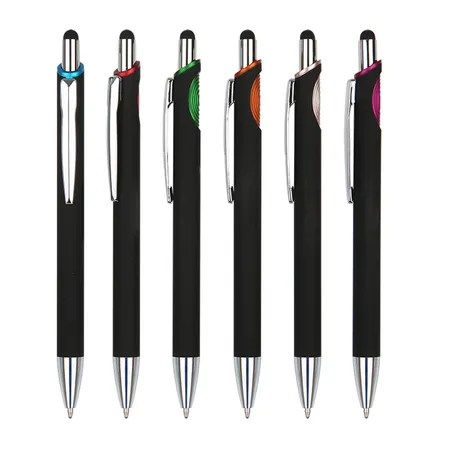 PUSH ACTION METAL BALL PEN, RUBBERIZED BLACK BARREL, CHROME PLATED CLIP, TIP, PUSH BUTTON AND TRIMS, TOP WITH BLACK TOUCH SCREEN STYLUS, 1.0MM BLACK X-20 BALL PEN REFILL.