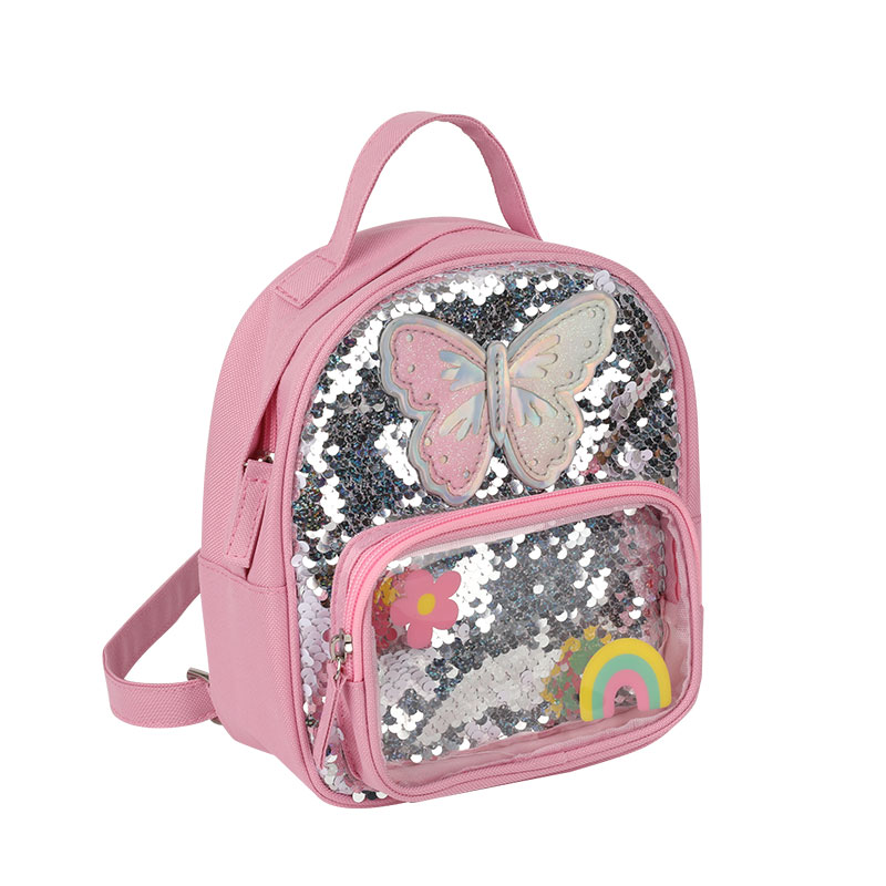BACKPACK, 180*75*210MM, MAIN POCKET AND TRANSPARENT PVC FRONT POCKET, PVC DIGITAL PRINTING, PINK TAPE AND ZIPPER.