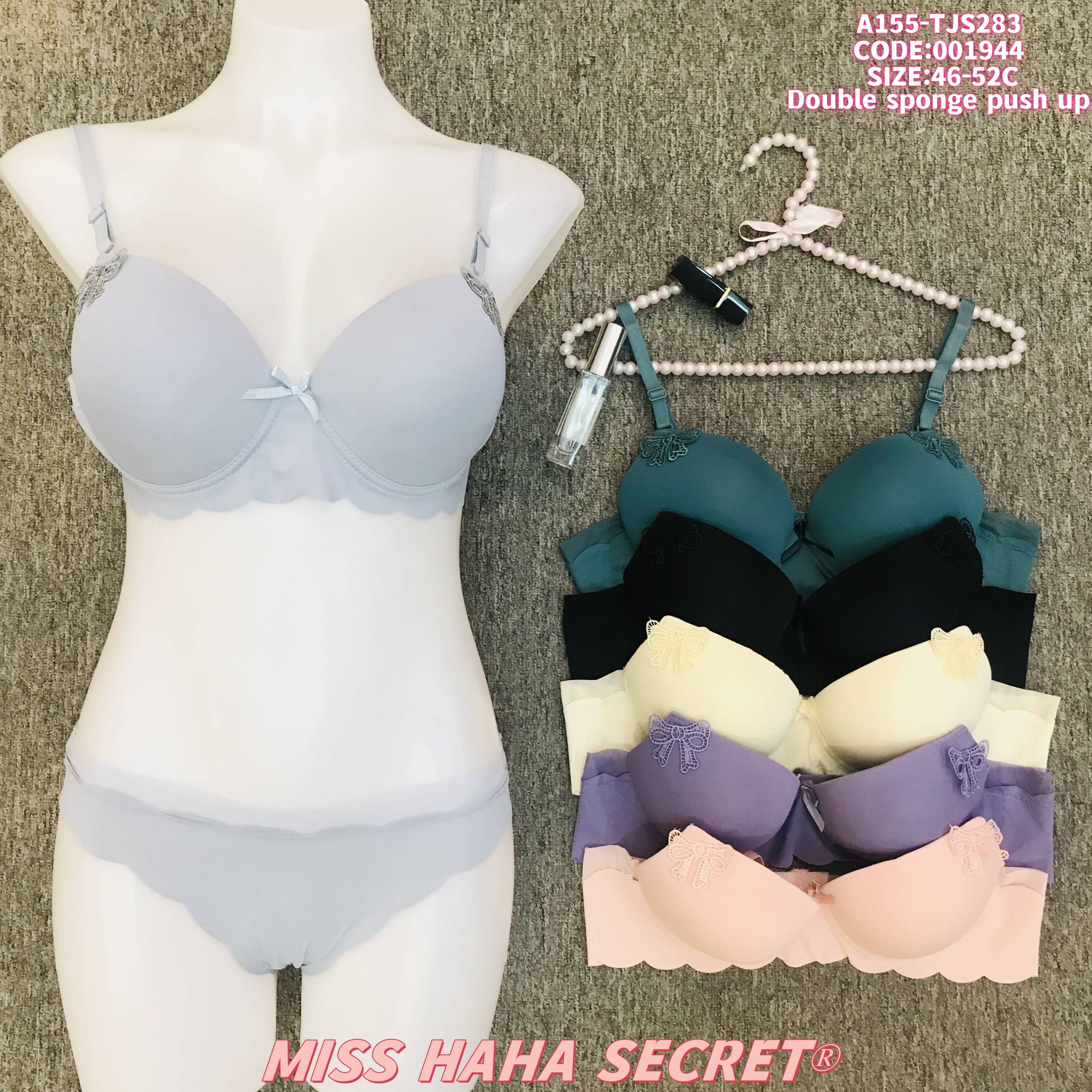 The MISS HAHA SECRET Double Sponge Push Up Bra Set offers both enhancement and elegance. Featuring double sponge padding for a lifted silhouette, it is adorned with delicate lace and bow details that add a feminine touch. Available in a range of soft colors (light gray, teal, black, cream, lavender, pink) and sized 46-52C, this set includes a matching panty with scalloped edges. It’s designed for those who seek a blend of comfort, style, and a flattering fit, making it suitable for everyday wear or special occasions where a touch of sophistication is desired.