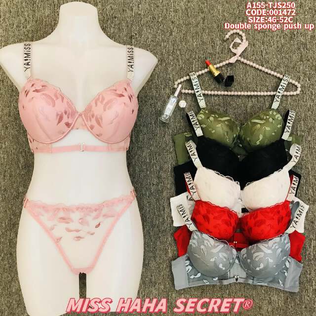Add a touch of elegance to your lingerie collection with the MISS HAHA SECRET lace double sponge push up bra and panty set. Featuring delicate lace detailing and double sponge push-up technology, this set offers both aesthetic appeal and exceptional lift. Available in a range of colors including pink, green, black, white, red, and gray, it caters to diverse style preferences. With a size range of 46-52C, it ensures a comfortable and supportive fit. The logo straps add a trendy element, making this set a perfect combination of style and functionality for those who desire confidence and sophistication in their intimate wear. Code: 001472, Style: A155-TJS250.
