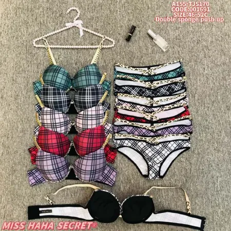 Upgrade your lingerie collection with this stylish MISS HAHA SECRET push-up bra set! Featuring a trendy mix of plaid patterns (teal, black, pink, red, purple) and leopard print details, these sets combine fashion and function. The double sponge push-up design delivers excellent lift and support, while the soft fabric ensures all-day comfort. Available in size 46-52C, each set includes a matching panty for a coordinated look. Perfect for adding a playful, chic touch to your daily wear!