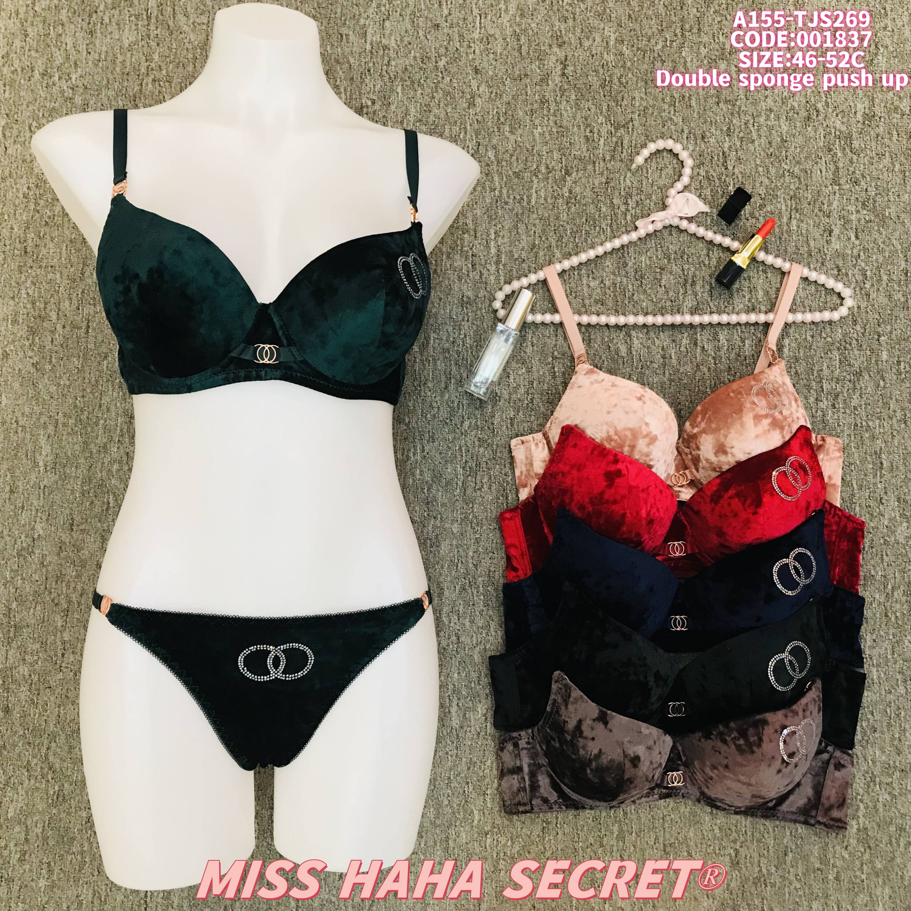 Elevate your lingerie game with the MISS HAHA SECRET Velvet Double Sponge Push Up Bra Set. Made from luxurious velvet fabric, this set features double sponge padding for impressive lift and shape, complemented by glamorous rhinestone accents that add a touch of sparkle. Available in a range of rich colors (emerald, blush, red, navy, black, taupe) and sizes 46-52C, it seamlessly blends opulence and comfort. The matching panty with coordinated rhinestone details completes the look, making it perfect for those who desire a combination of sophistication and allure. Whether for a special occasion or to add a lavish touch to your daily wear, this lingerie set delivers both style and a confident fit.