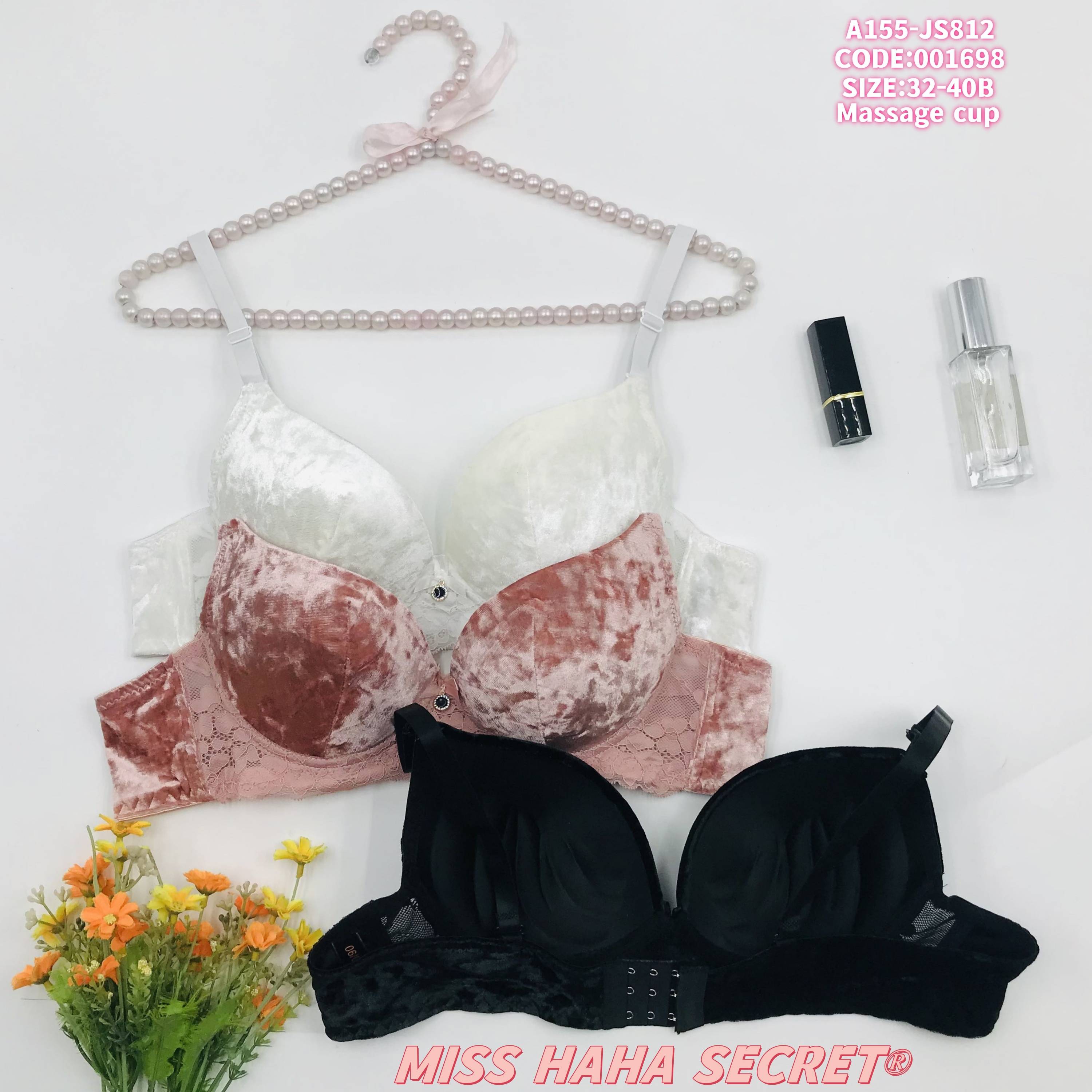 Indulge in luxury with this 3-piece bra set from MISS HAHA SECRET (Style: A155-JS812, Code: 001698)! Crafted with soft velvet fabric in cream, pink, and black, each bra features a massage cup for gentle, all-day support—paired with delicate details (like lace accents) for a romantic touch. Available in sizes 32-40B, this set blends opulent texture with practical comfort, perfect for elevating your lingerie drawer.