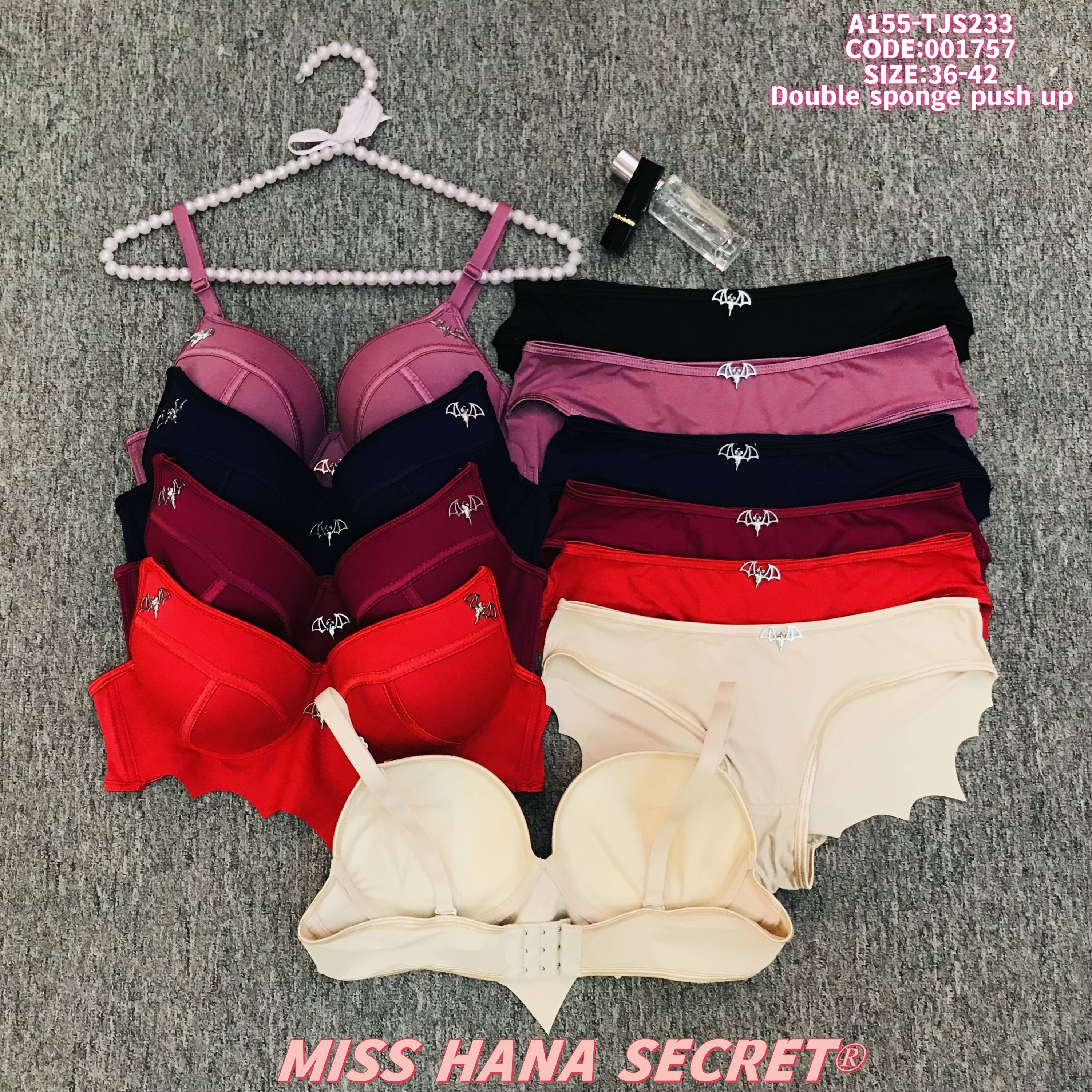 Add a playful edge to your lingerie with this MISS HANA SECRET push-up set! Featuring a double sponge design for excellent lift, it’s paired with cute bat-shaped embellishments (on both bra and matching panty) for a unique, trendy touch. Available in bold colors (pink, black, navy, burgundy, red, beige), the soft fabric ensures all-day comfort while the scalloped edges and central buckle detail elevate the style. Sizes 36-42—perfect for combining support, personality, and fashion in your daily wear.