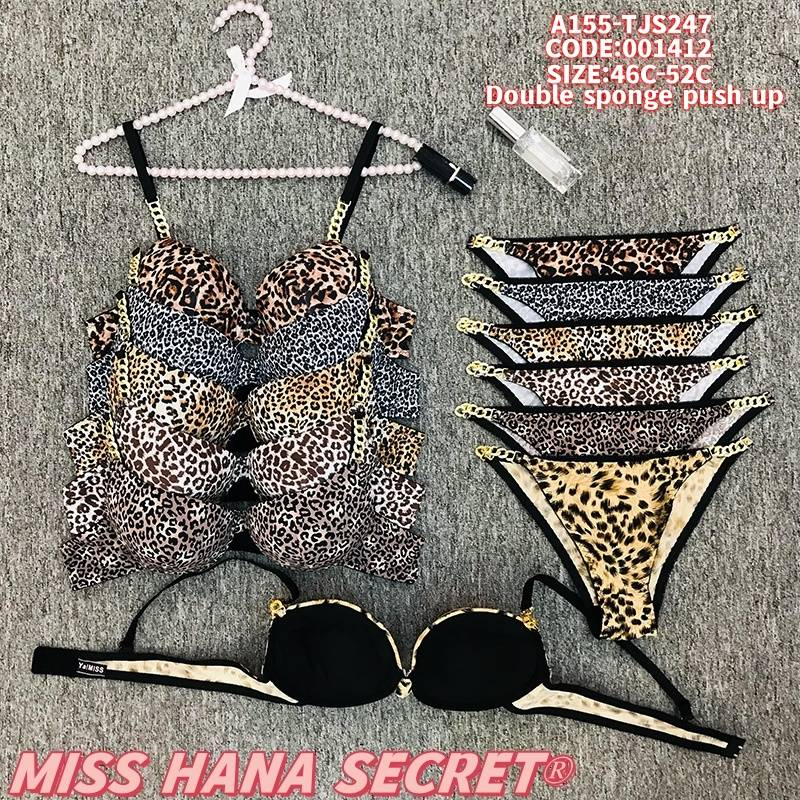 Elevate your intimate wear with the MISS HANA SECRET leopard print double sponge push up bra and panty set. Boasting double sponge push-up technology, it delivers exceptional lift and contouring. The set showcases a variety of stylish leopard patterns, adding a bold and trendy touch to your lingerie collection. Available in size range 46C-52C, it ensures a comfortable and supportive fit. The delicate strap details and cohesive design make it a perfect blend of fashion and functionality, ideal for those seeking confidence and style in their undergarments. Code: 001412, Style: A155-TJS247.