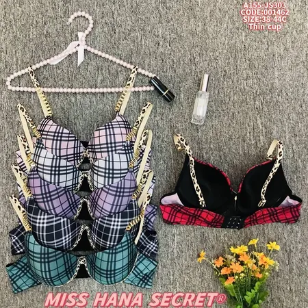 Stand out with this MISS HANA SECRET thin cup bra—a bold blend of plaid patterns (pink, purple, black, teal) and eye-catching leopard-print straps! Designed for size 38-44C (code: 001462), the thin-cup construction ensures breathability, while the mixed-pattern details add a trendy, edgy-feminine vibe. Perfect for adding personality to your intimate wear collection, it balances comfort and unique style for daily or special-occasion wear.