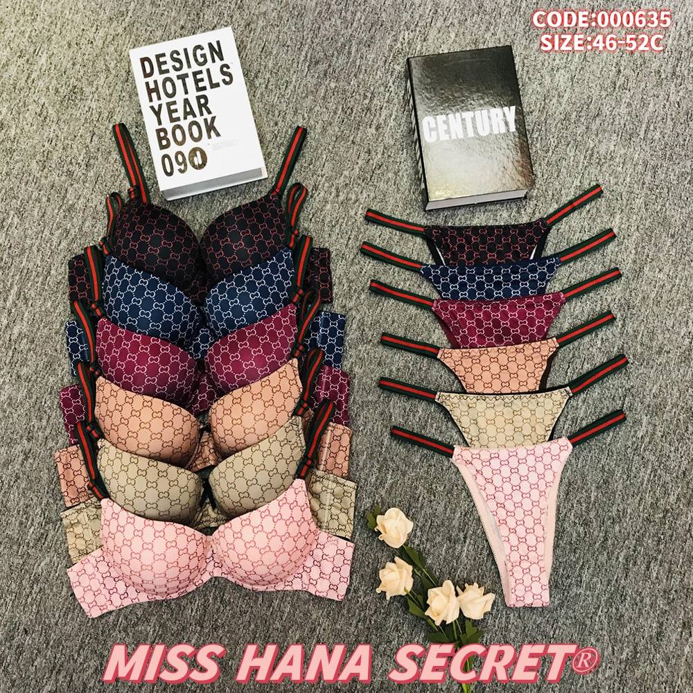 Elevate your lingerie collection with this stylish bra and panty set from MISS HANA SECRET! Featuring a chic inspired monogram pattern, it comes in 5 trendy colors (dark red, navy, burgundy, beige, pink) to match your mood. The set includes a push-up bra with adjustable red-green striped straps and a matching thong-style panty, designed for both comfort and fashion. Available in size 46-52C (code: 000635), it’s perfect for daily wear or special occasions.