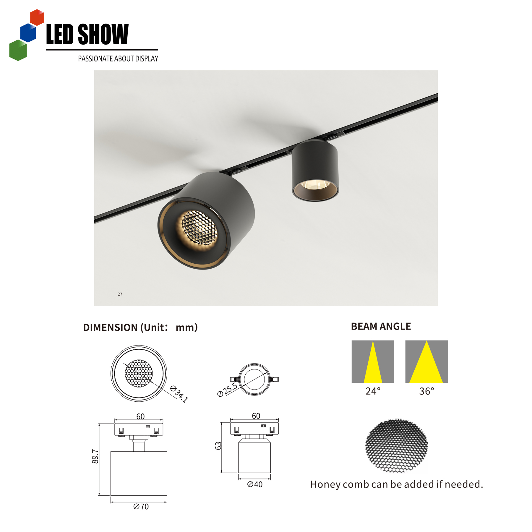 The ML Series Professional Track Lights offer versatile beam angle options (24° and 36°) with optional honeycomb anti-glare accessories, providing precise lighting control for commercial applications. Featuring high color rendering (Ra≥90) and multiple size configurations, these spotlights deliver optimal illumination while minimizing glare. The innovative design allows for flexible customization to meet specific lighting requirements in various environments.