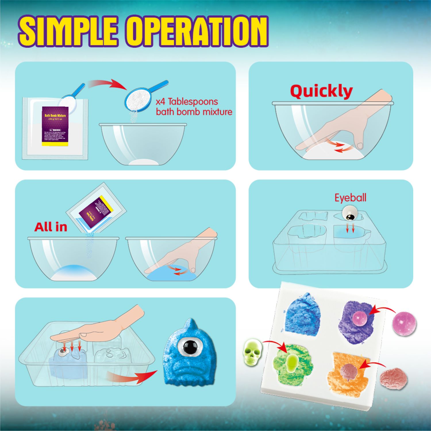 Monster Bath Bomb Kit is easy to make and easy to use, throwing in the water will produce a lot of bubbles. This set of toys is more interesting and more popular with children than some plastic bath toys, and it can improve the child’s hands-on ability and help the child fall in love with the bath.