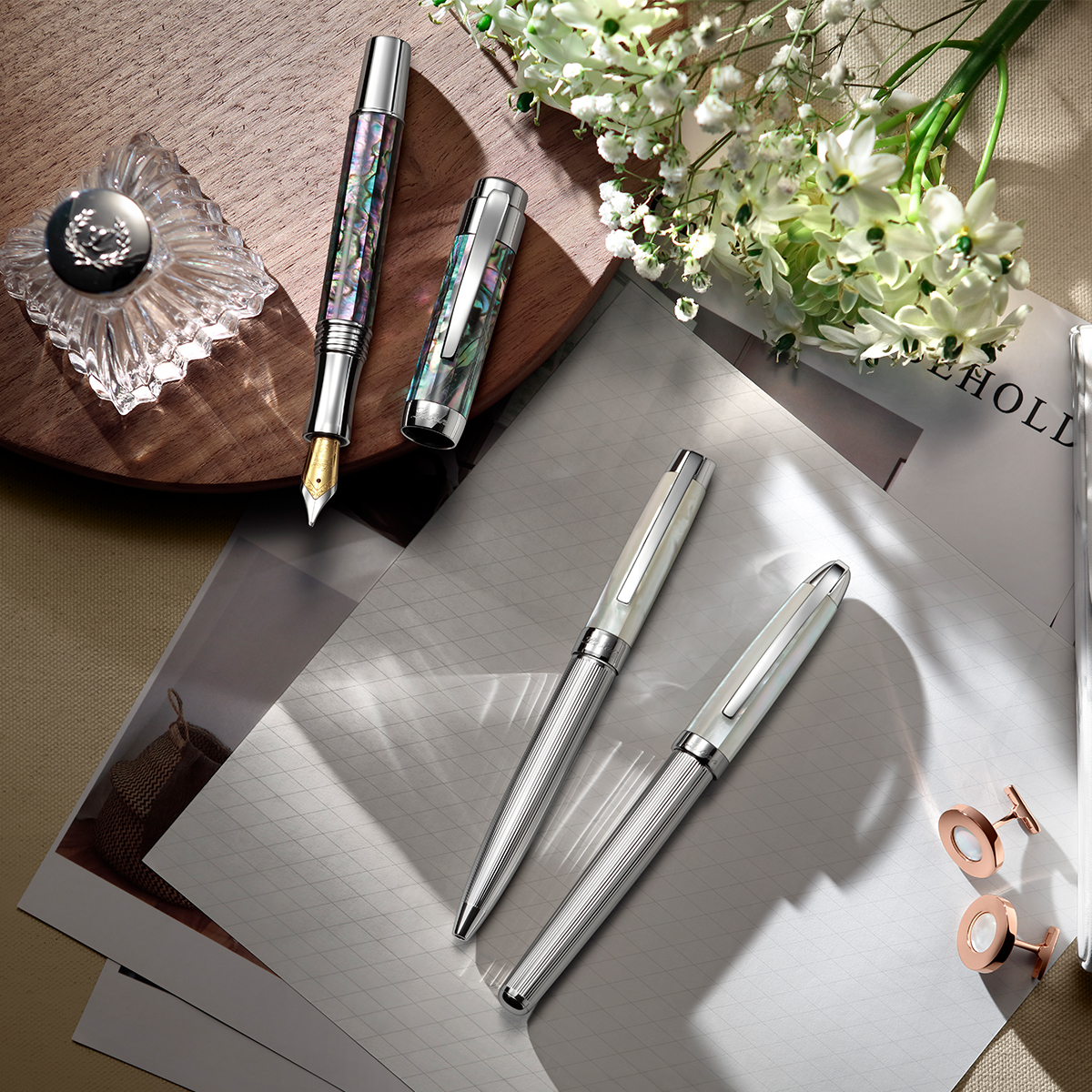 The materials of a MOP fountain pen are the true natural mother of pearl and resin lacquer. It is a harmonious and balanced pen as if there is a tiny universe in hand.