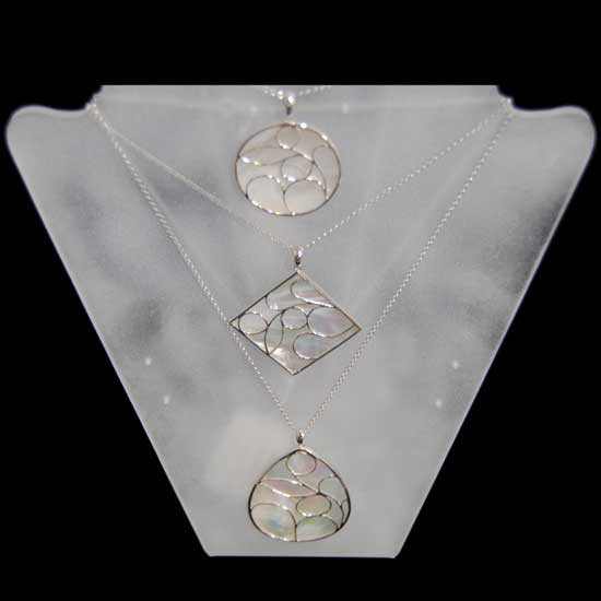 This pendant features a rhombus-shaped frame with charming thread-like details within. The jewelry comes with a whitish MOP setting with very subtle colors. This piece is sure to add a touch of simple elegance to your neckline.