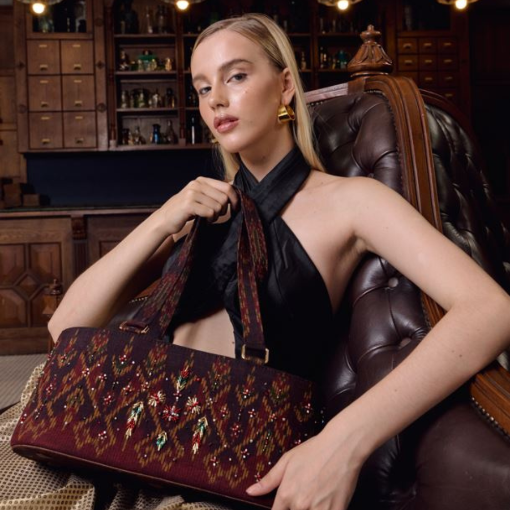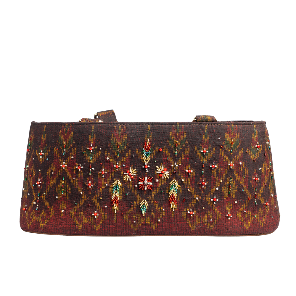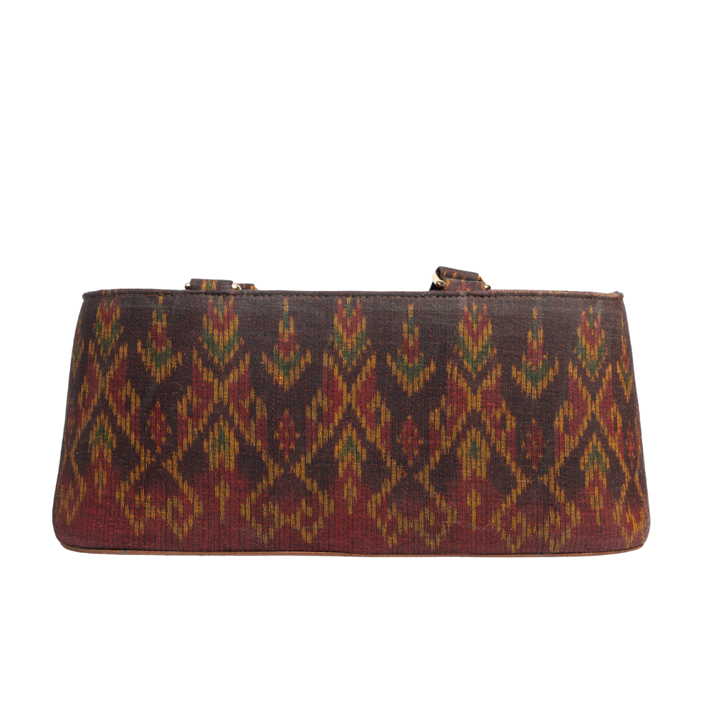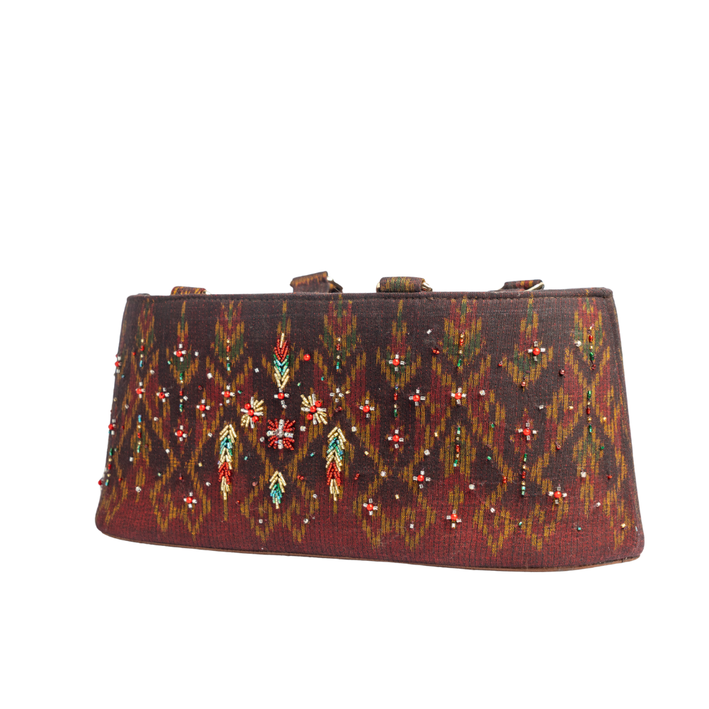 A baguette-shaped handbag is a stylish and spacious accessory inspired by a boxing champion's iconic belt. The top is finished with a drawstring closure, providing both security and an authentic Muay Thai Boxing style.