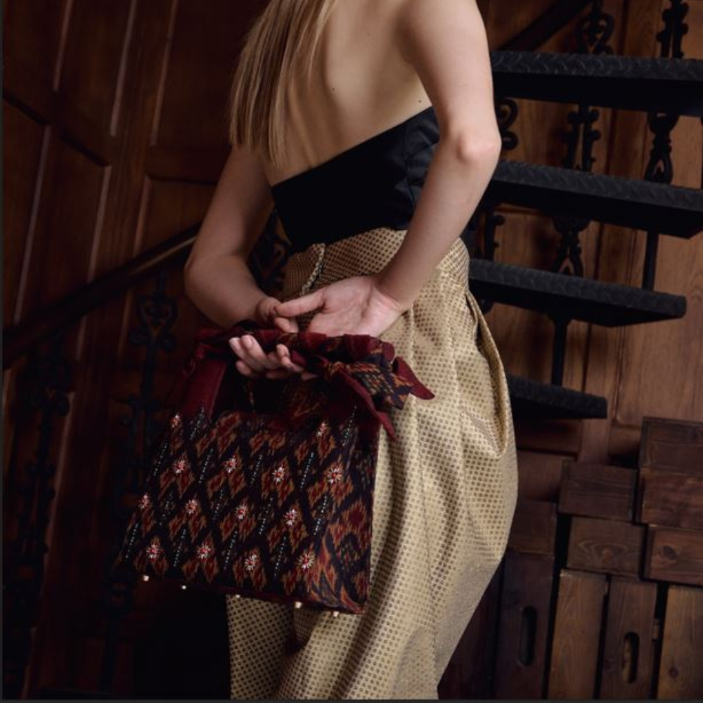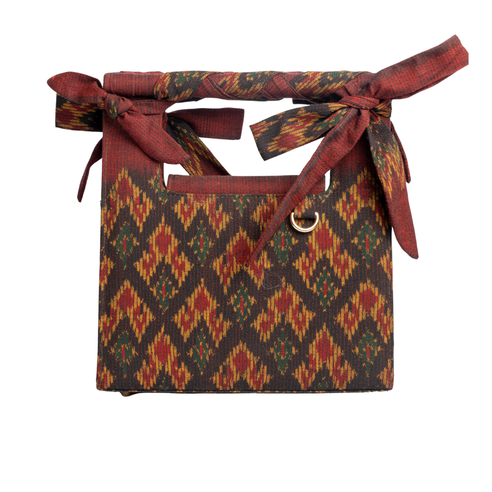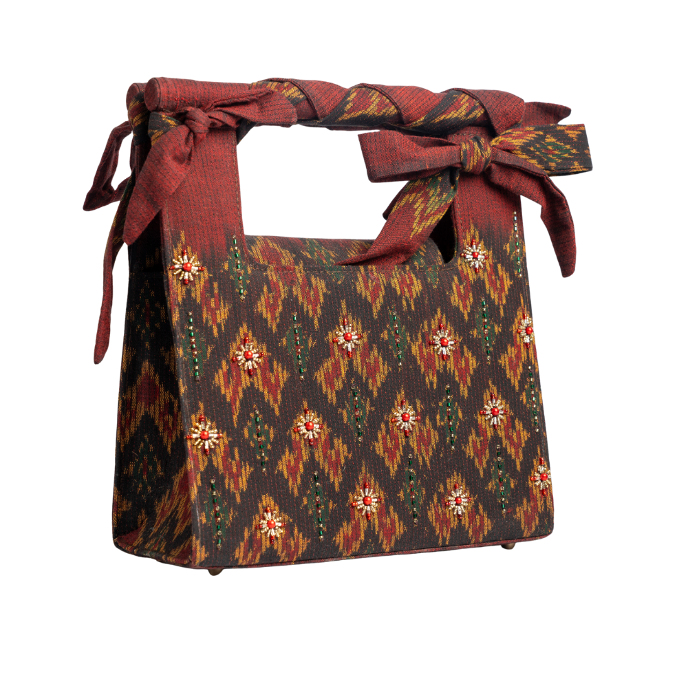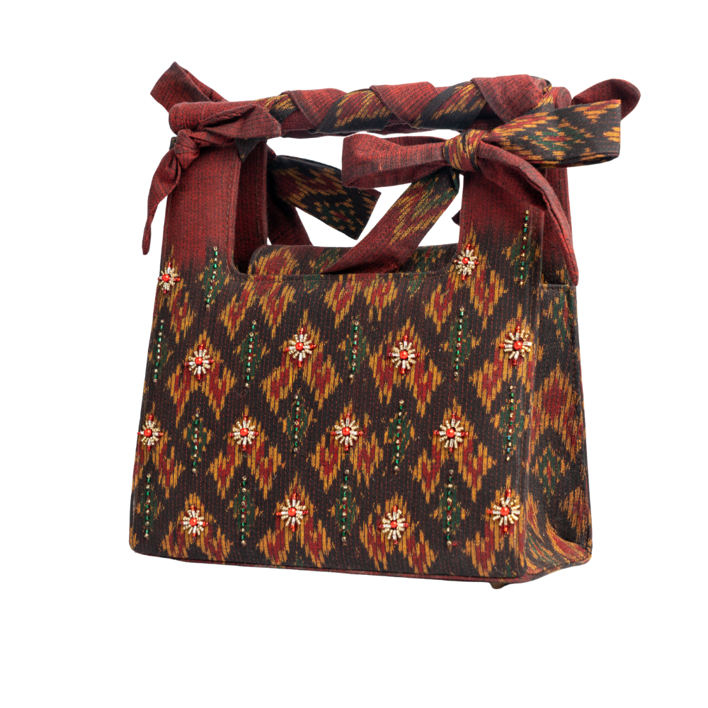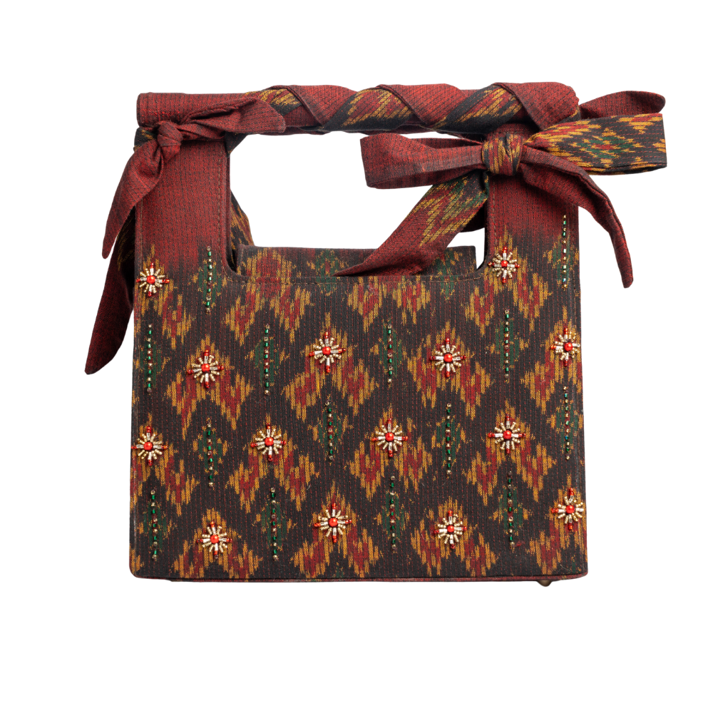 The top-handle two-tone tote is timeless elegance. It is hand-woven from exquisite Thai fabric. Delicate hand embroidery adorns the front, adding a touch of artisanal charm to its sophisticated design.