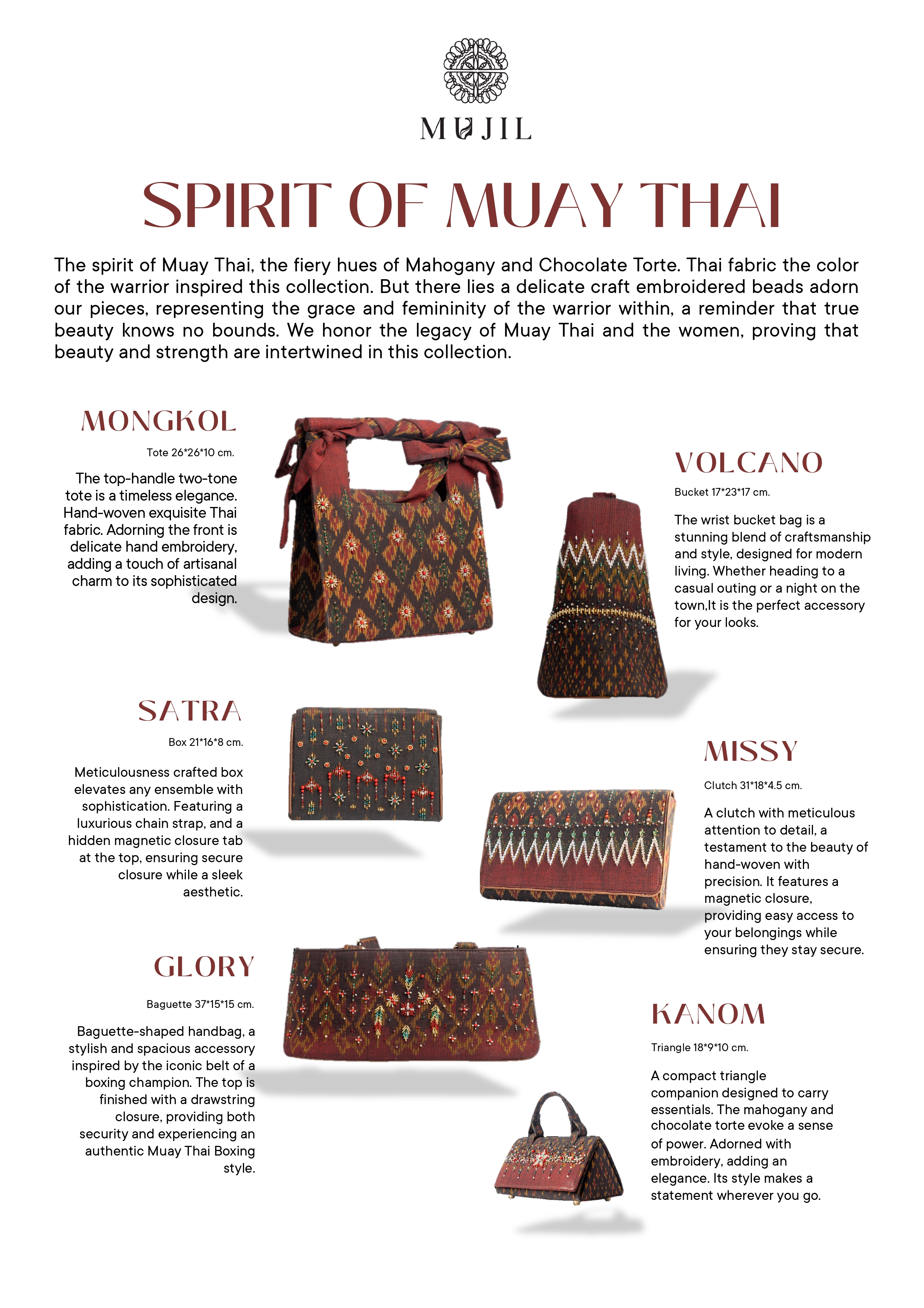 "Mongkol" is named for the auspicious headband worn by boxers. The rope tied with a bow over the top handle of the bag represents auspiciousness. Mongkol symbolizes happiness and prosperity, bringing luck and joy to those who wear it.