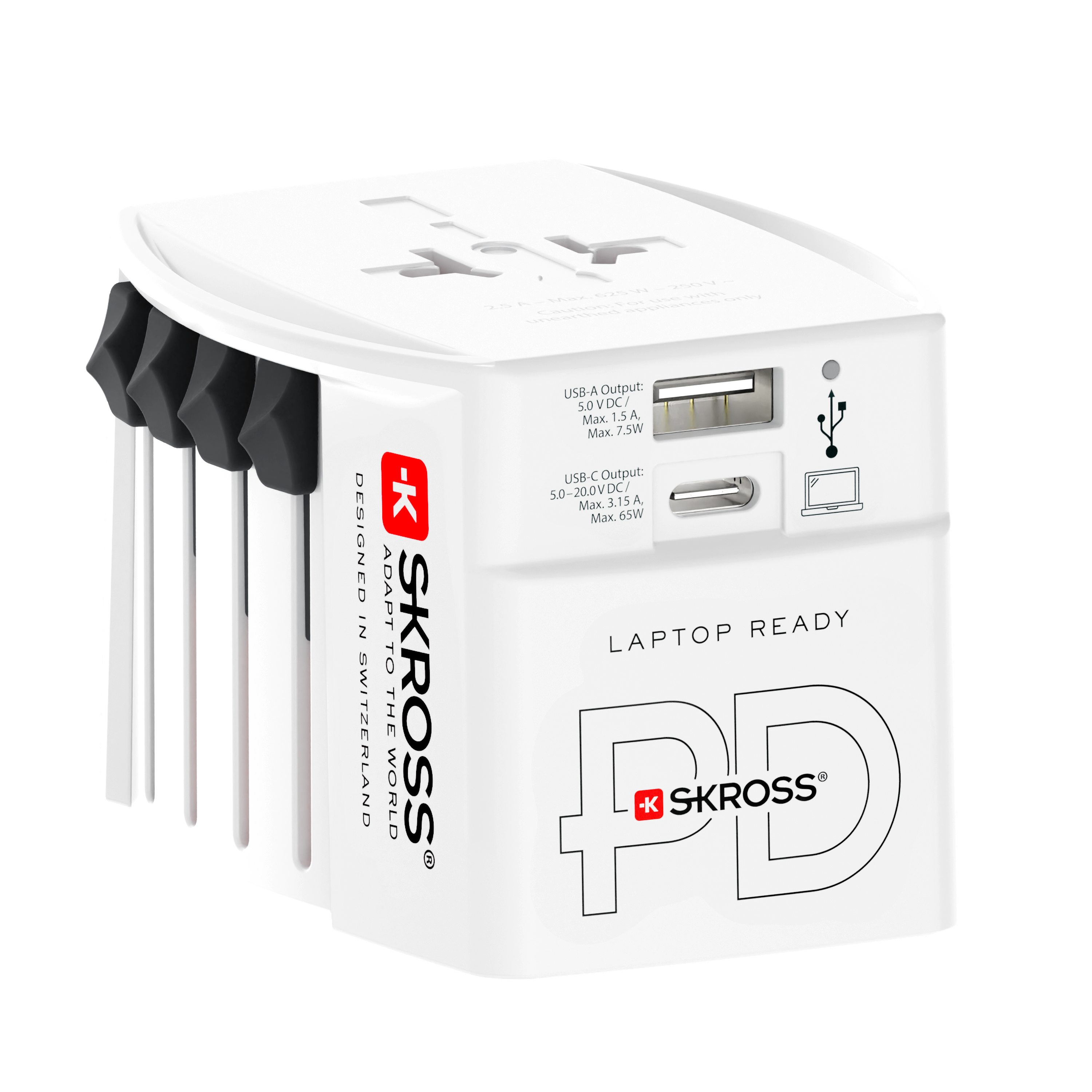 With the World Adapter MUV USB AC65PD from SKROSS® travellers from all over the world can charge a USB C device as well as a regular USB device while
