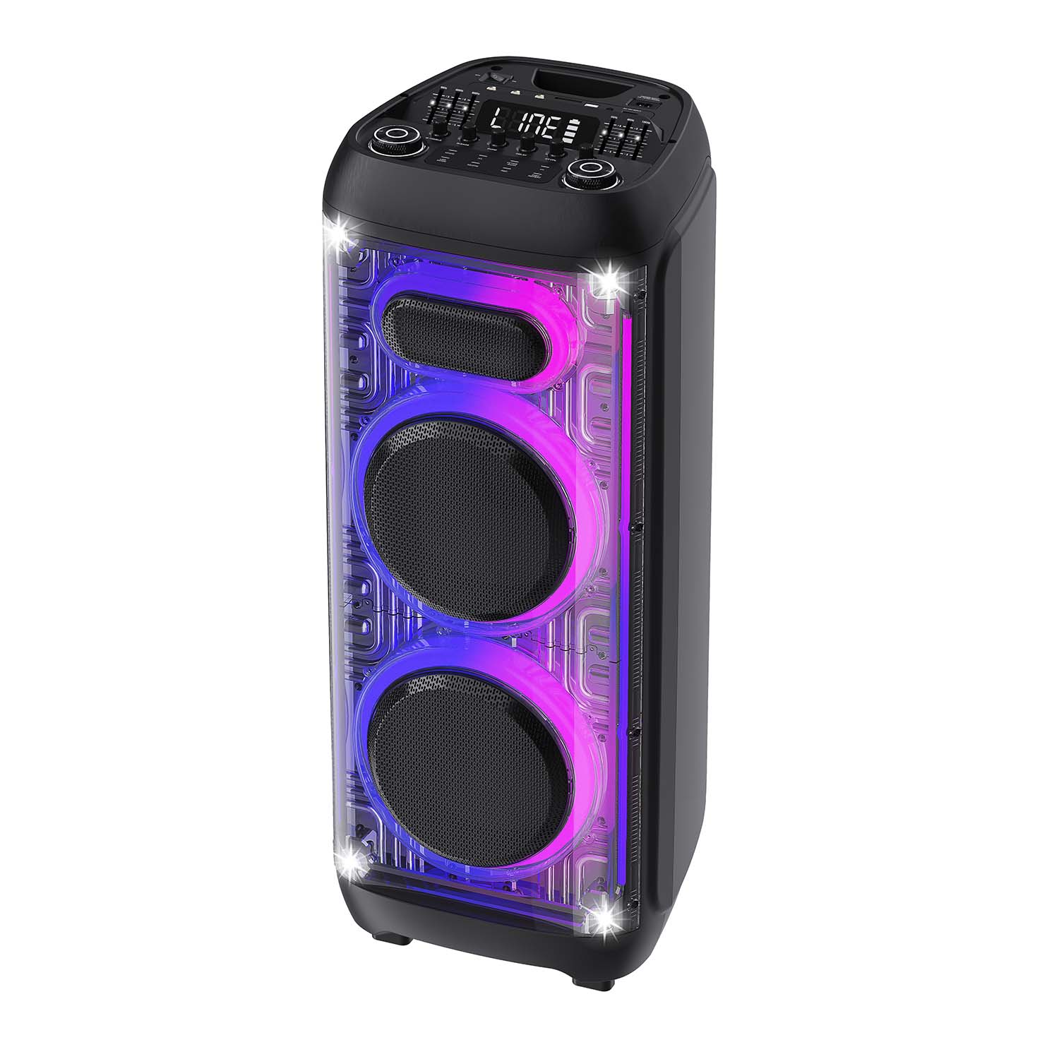 TWS/USB/SD/Bluetooth/FM/Recording/EQUALIZER/LED on/off,Mic priority, X-bass control,Music spectrum LED light.