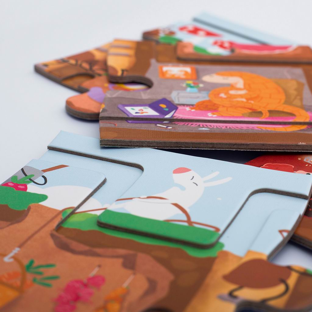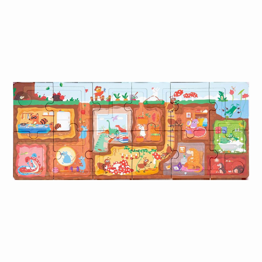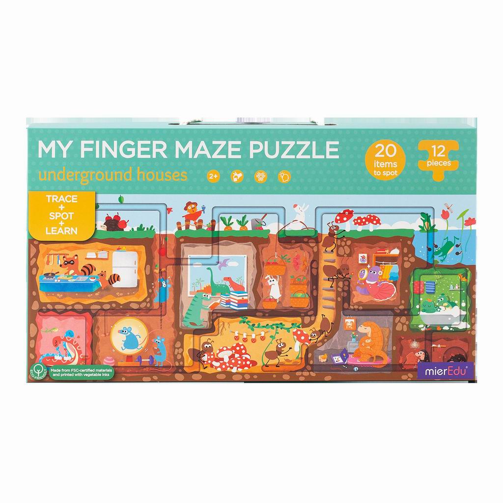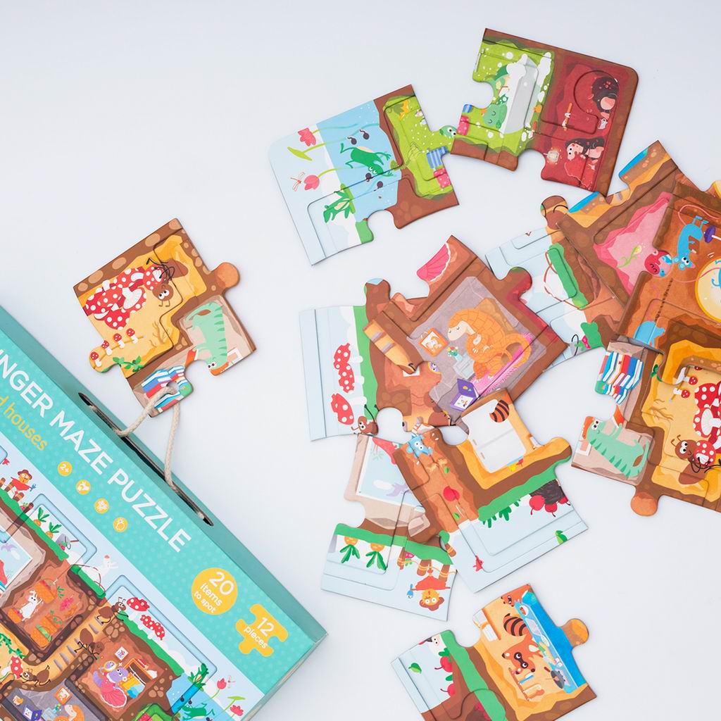 underground houses-Trace, spot, and learn. This finger maze puzzle allows kids to put the brightly-illustrated jigsaw puzzle pieces together, before they follow the maze with their finger. As their finger traces the route to the finish, can they spot the 20 things hidden in the puzzle scene? This game encourages sensory and fine motor development for little ones.