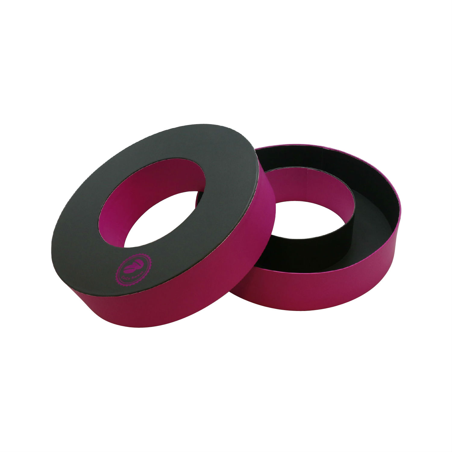 Featured here is a cardboard box for macaroon display. It has a round silhouette with a hollow center and is covered with a lid. This macaroon display box offers a good presentation of macaroons and is excellent for attracting customers.