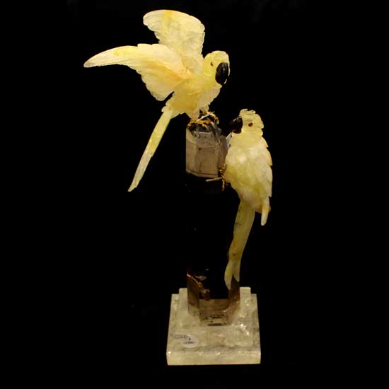 This pair of beautiful macaws sculpture is carved with natural semi-precious stones. The sculpture with detailed carving brings out the natural demeanor on these macaws. This is a brilliant decorative art sculpture.