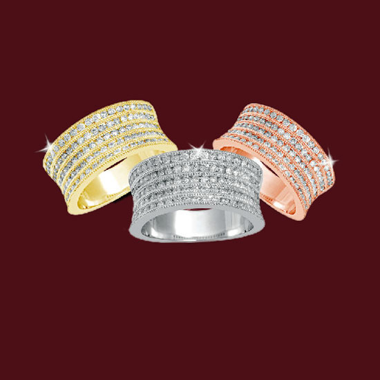 These machine-made wedding bands are available in different gold karats. Every piece is carefully set in the machine for an excellent finish. Each stone is calibrated as per requirement so there is life-time warranty for setting.