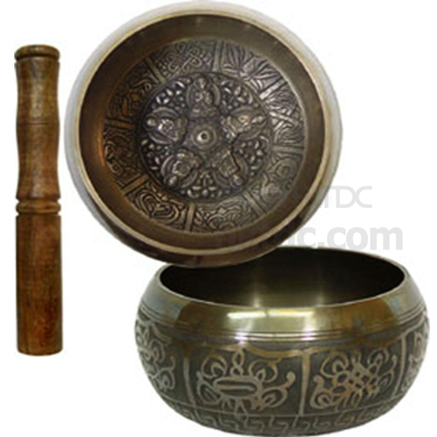 Beautifully crafted with dark metal, this Buddhist singing bowl is used for meditation, trance-induction, relaxation, healthcare, personal well-being and religious practice. The well and exterior are etched with captivating religious pattern, which makes the bowl a decorative piece on its own.