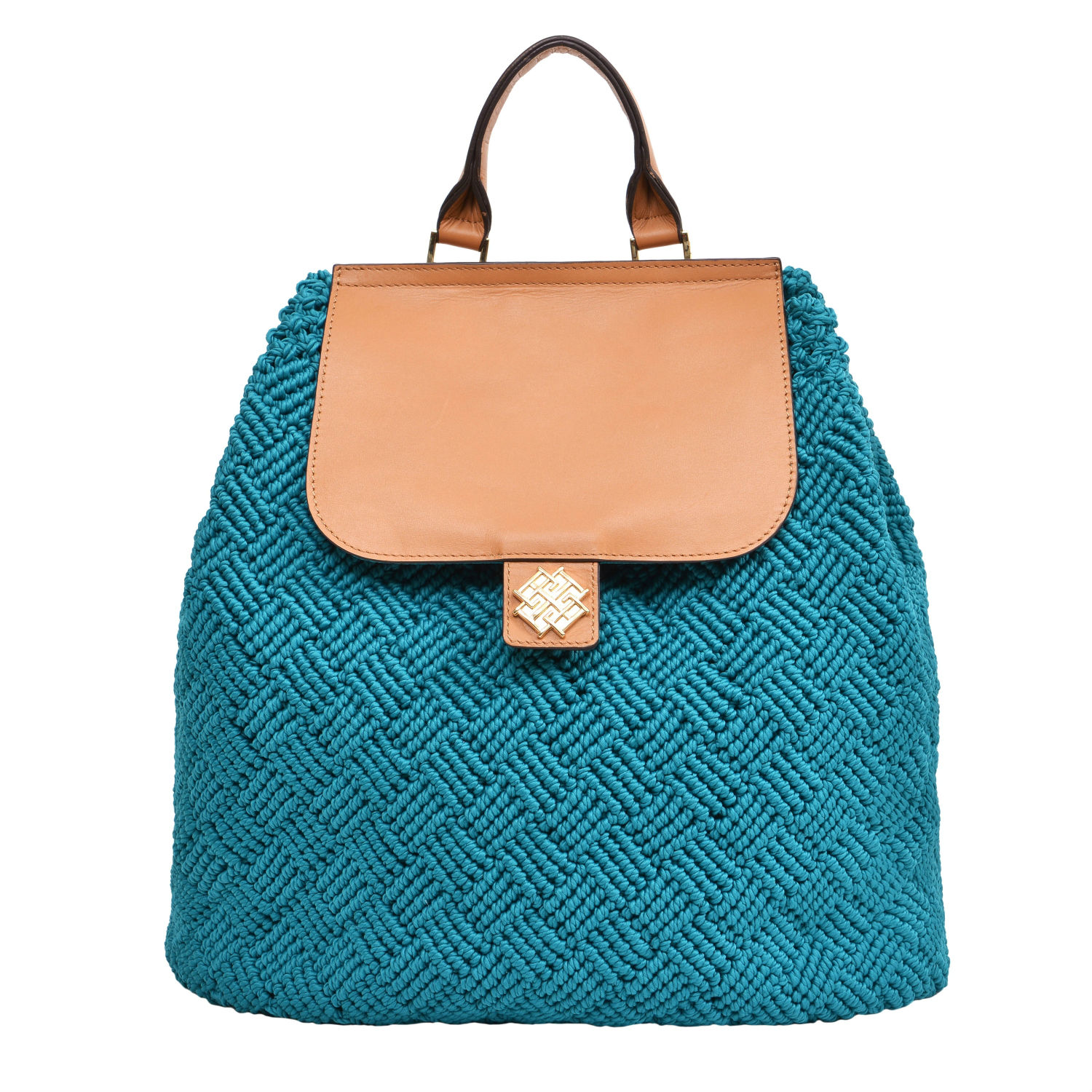 • Hand woven macrame backpack with leather cover, base and shoulder straps